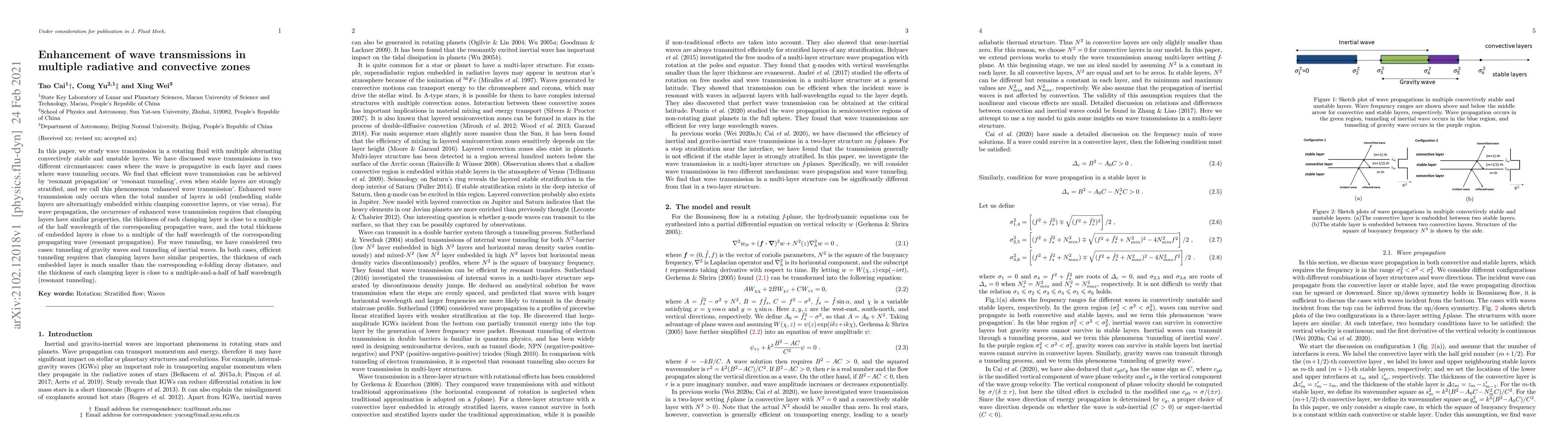 In this paper, we study wave transmission in a rotating fluid with multiple alternating convectively stable and unstable layers. We have discussed wave transmissions in two different circumstances: cases where the wave is propagative in each layer and cases where wave tunneling occurs. We find that efficient wave transmission can be achieved by `resonant propagation' or `resonant tunneling', even when stable layers are strongly stratified, and we call this phenomenon `enhanced wave transmission'. Enhanced wave transmission only occurs when the total number of layers is odd (embedding stable layers are alternatingly embedded within clamping convective layers, or vise versa). For wave propagation, the occurrence of enhanced wave transmission requires that clamping layers have similar properties, the thickness of each clamping layer is close to a multiple of the half wavelength of the corresponding propagative wave, and the total thickness of embedded layers is close to a multiple of the half wavelength of the corresponding propagating wave (resonant propagation). For wave tunneling, we have considered two cases: tunneling of gravity waves and tunneling of inertial waves. In both cases, efficient tunneling requires that clamping layers have similar properties, the thickness of each embedded layer is much smaller than the corresponding e-folding decay distance, and the thickness of each clamping layer is close to a multiple-and-a-half of half wavelength (resonant tunneling).