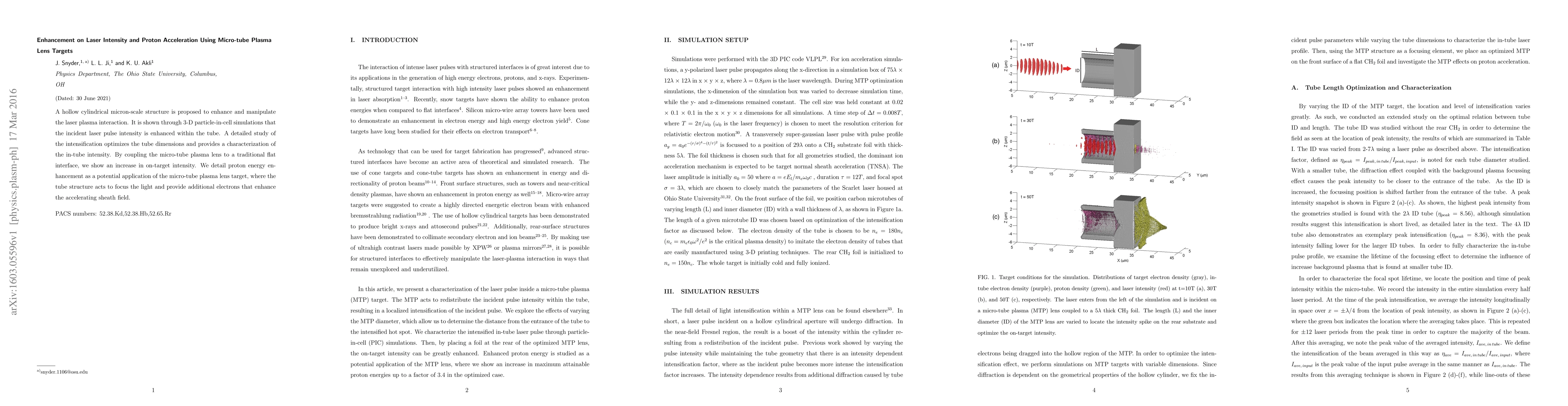 A hollow cylindrical micron-scale structure is proposed to enhance and manipulate the laser plasma interaction. It is shown through 3-D particle-in-cell simulations that the incident laser pulse intensity is enhanced within the tube. A detailed study of the intensification optimizes the tube dimensions and provides a characterization of the in-tube intensity. By coupling the micro-tube plasma lens to a traditional flat interface, we show an increase in on-target intensity. We detail proton energy enhancement as a potential application of the micro-tube plasma lens target, where the tube structure acts to focus the light and provide additional electrons that enhance the accelerating sheath field.