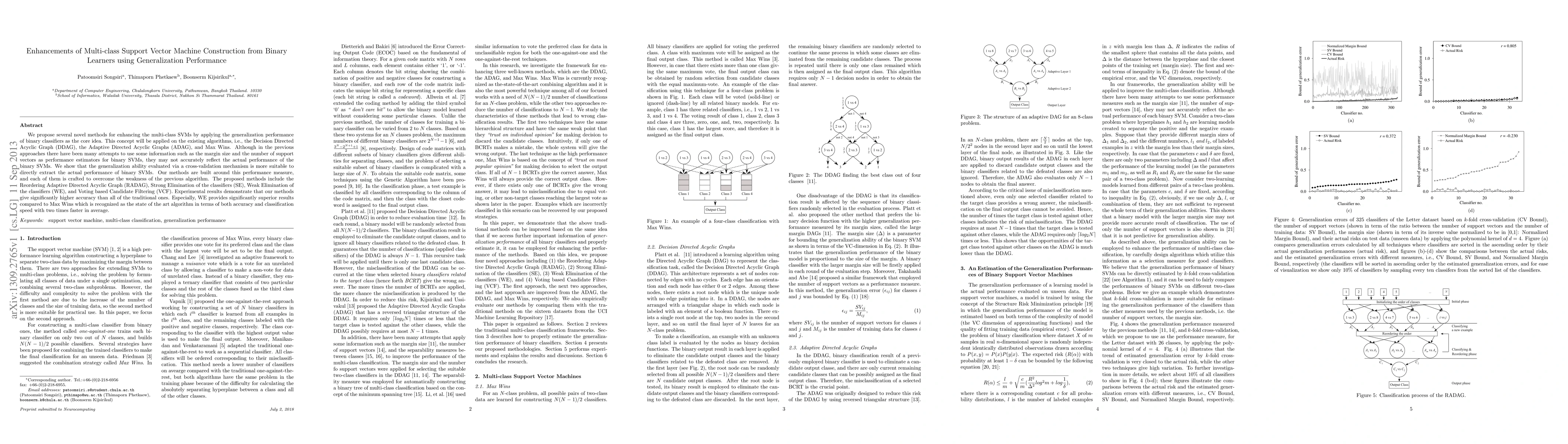 We propose several novel methods for enhancing the multi-class SVMs by applying the generalization performance of binary classifiers as the core idea. This concept will be applied on the existing algorithms, i.e., the Decision Directed Acyclic Graph (DDAG), the Adaptive Directed Acyclic Graphs (ADAG), and Max Wins. Although in the previous approaches there have been many attempts to use some information such as the margin size and the number of support vectors as performance estimators for binary SVMs, they may not accurately reflect the actual performance of the binary SVMs. We show that the generalization ability evaluated via a cross-validation mechanism is more suitable to directly extract the actual performance of binary SVMs. Our methods are built around this performance measure, and each of them is crafted to overcome the weakness of the previous algorithm. The proposed methods include the Reordering Adaptive Directed Acyclic Graph (RADAG), Strong Elimination of the classifiers (SE), Weak Elimination of the classifiers (WE), and Voting based Candidate Filtering (VCF). Experimental results demonstrate that our methods give significantly higher accuracy than all of the traditional ones. Especially, WE provides significantly superior results compared to Max Wins which is recognized as the state of the art algorithm in terms of both accuracy and classification speed with two times faster in average.