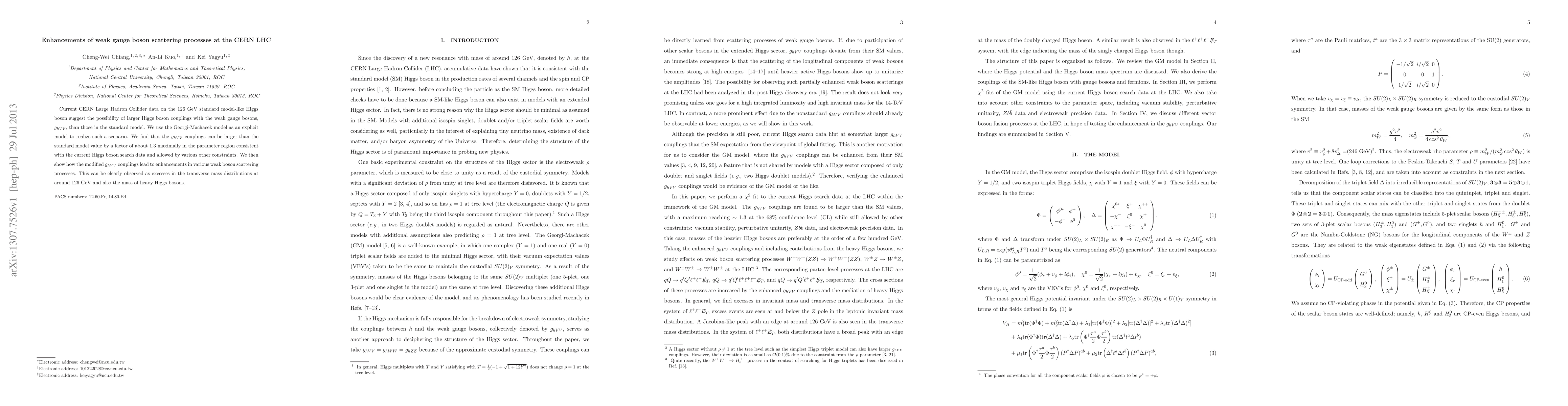 Current CERN Large Hadron Collider data on the 126 GeV standard model-like Higgs boson suggest the possibility of larger Higgs boson couplings with the weak gauge bosons, $g_{hVV}$, than those in the standard model. We use the Georgi-Machacek model as an explicit model to realize such a scenario. We find that the $g_{hVV}$ couplings can be larger than the standard model value by a factor of about 1.3 maximally in the parameter region consistent with the current Higgs boson search data and allowed by various other constraints. We then show how the modified $g_{hVV}$ couplings lead to enhancements in various weak boson scattering processes. This can be clearly observed as excesses in the transverse mass distributions at around 126 GeV and also the mass of heavy Higgs bosons.