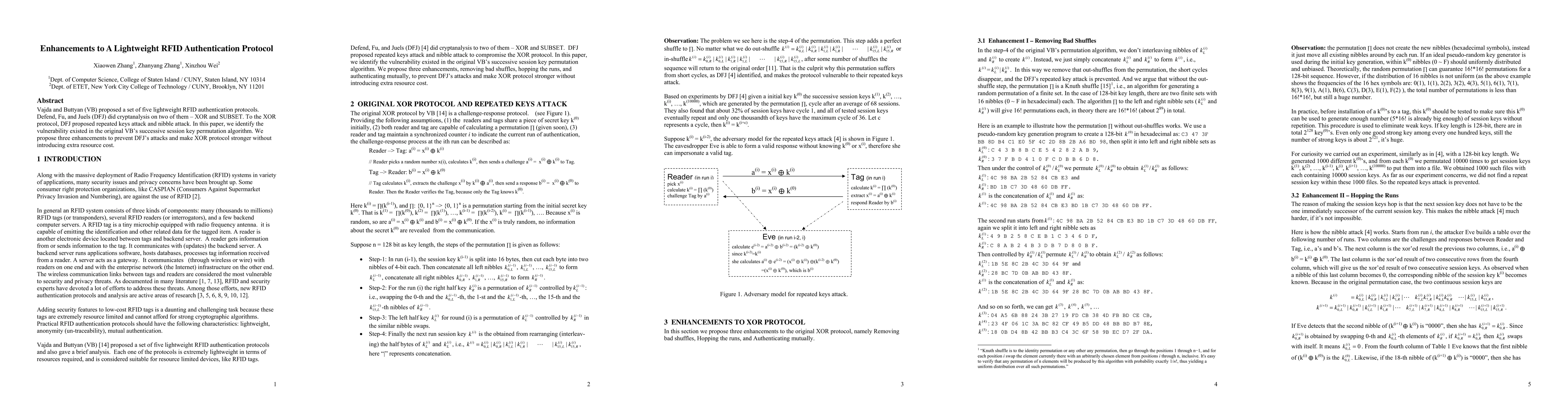 This paper identifies vulnerabilities in the original VB's successive session key permutation algorithm for RFID authentication. It proposes three enhancements to strengthen the XOR protocol against DFJ's attacks without increasing resource costs.