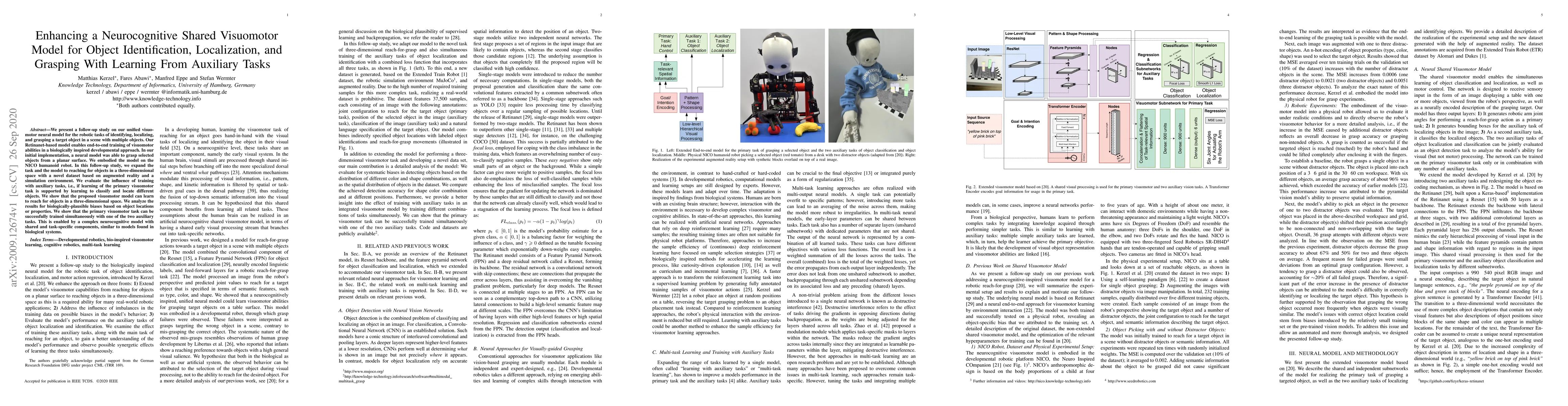 This study enhances a neurocognitive shared visuomotor model for identifying, localizing, and grasping objects in 3D space using augmented reality and simulation. The model, trained with auxiliary tasks like object classification, shows improved performance, suggesting a biologically-inspired approach with shared and task-specific components.