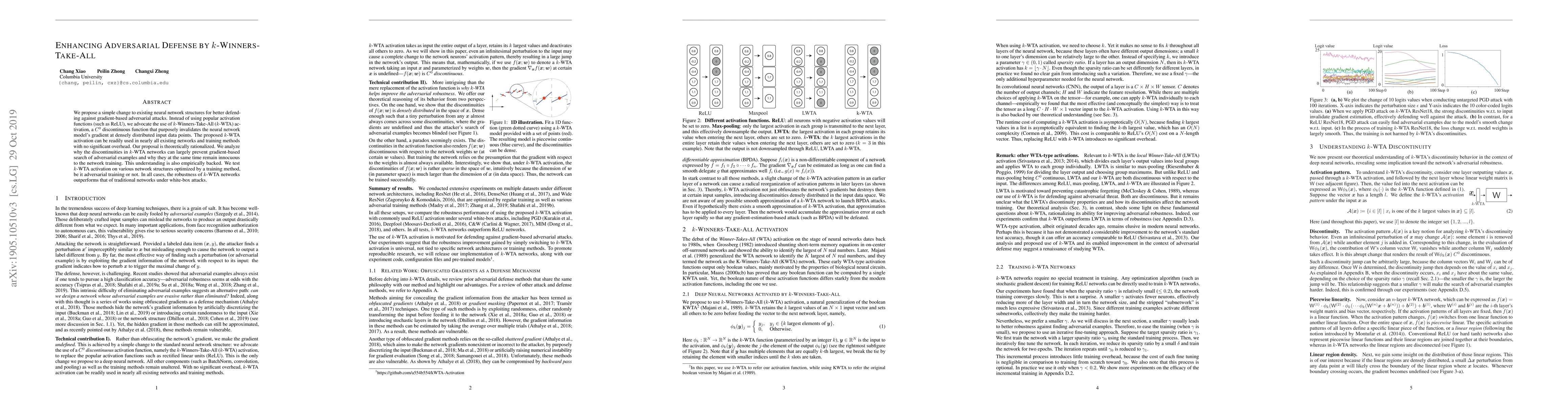 This paper proposes using k-Winners-Take-All (k-WTA) activation to enhance neural network defenses against adversarial attacks. The k-WTA activation, a C0 discontinuous function, invalidates gradients at densely distributed input points, effectively thwarting gradient-based adversarial search while maintaining training efficiency.