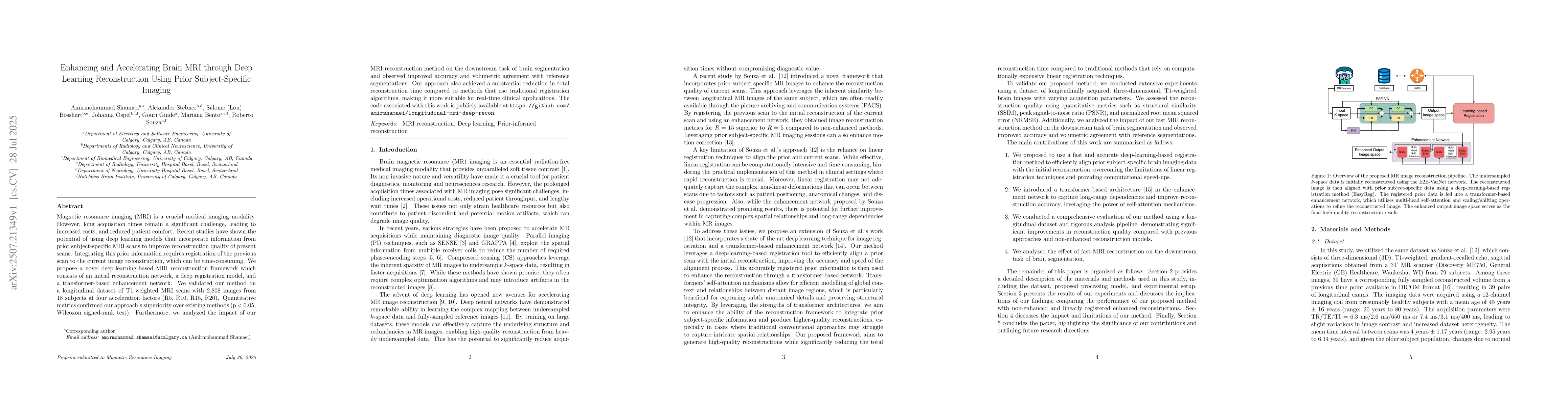 Magnetic resonance imaging (MRI) is a crucial medical imaging modality. However, long acquisition times remain a significant challenge, leading to increased costs, and reduced patient comfort. Recent studies have shown the potential of using deep learning models that incorporate information from prior subject-specific MRI scans to improve reconstruction quality of present scans. Integrating this prior information requires registration of the previous scan to the current image reconstruction, which can be time-consuming. We propose a novel deep-learning-based MRI reconstruction framework which consists of an initial reconstruction network, a deep registration model, and a transformer-based enhancement network. We validated our method on a longitudinal dataset of T1-weighted MRI scans with 2,808 images from 18 subjects at four acceleration factors (R5, R10, R15, R20). Quantitative metrics confirmed our approach's superiority over existing methods (p < 0.05, Wilcoxon signed-rank test). Furthermore, we analyzed the impact of our MRI reconstruction method on the downstream task of brain segmentation and observed improved accuracy and volumetric agreement with reference segmentations. Our approach also achieved a substantial reduction in total reconstruction time compared to methods that use traditional registration algorithms, making it more suitable for real-time clinical applications. The code associated with this work is publicly available at https://github.com/amirshamaei/longitudinal-mri-deep-recon.