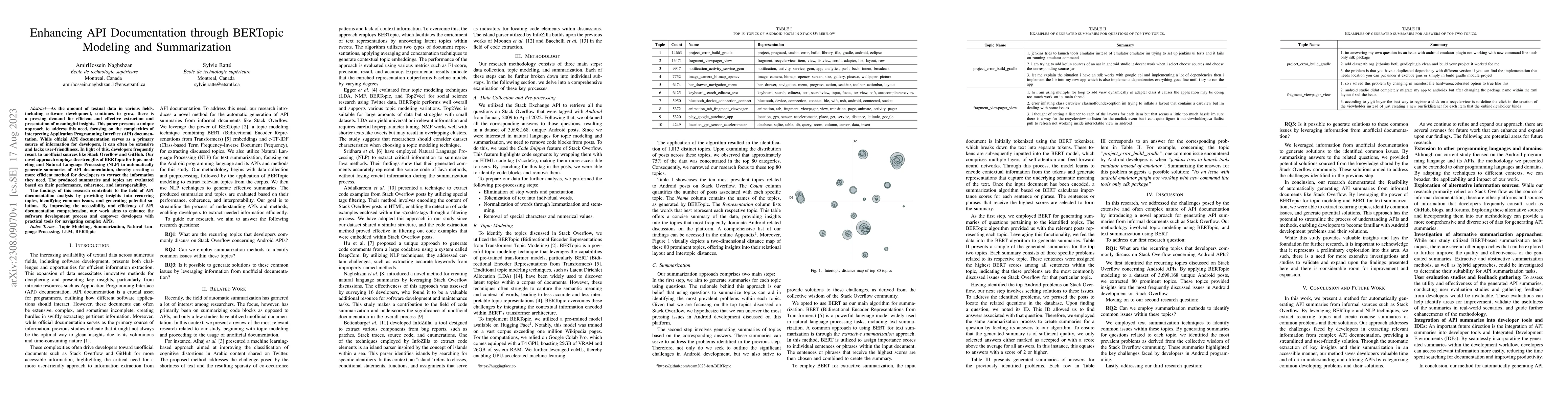 This paper introduces a method using BERTopic for topic modeling and NLP summarization to enhance API documentation accessibility. It aims to generate coherent summaries that improve developers' comprehension of extensive API documentation, thereby reducing reliance on unofficial sources.