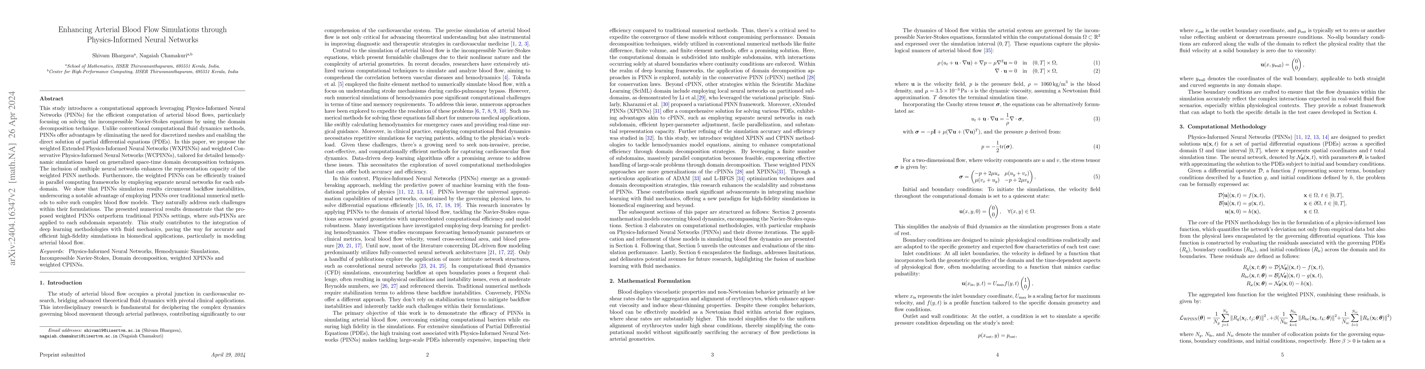 This study proposes Physics-Informed Neural Networks (PINNs) with weighted extensions (WXPINNs and WCPINNs) to efficiently simulate arterial blood flow by solving the incompressible Navier-Stokes equations, outperforming traditional numerical methods and offering mesh-free, direct PDE solutions. The method enhances representation capacity and stability through parallel neural network training and domain decomposition techniques.