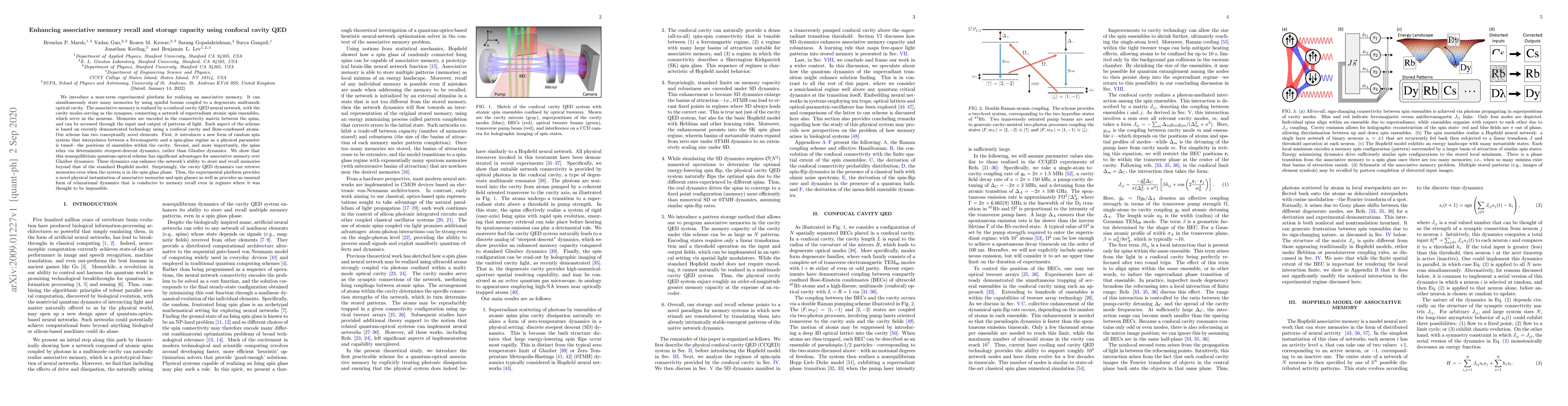 We introduce a near-term experimental platform for realizing an associative memory. It can simultaneously store many memories by using spinful bosons coupled to a degenerate multimode optical cavity. The associative memory is realized by a confocal cavity QED neural network, with the cavity modes serving as the synapses, connecting a network of superradiant atomic spin ensembles, which serve as the neurons. Memories are encoded in the connectivity matrix between the spins, and can be accessed through the input and output of patterns of light. Each aspect of the scheme is based on recently demonstrated technology using a confocal cavity and Bose-condensed atoms. Our scheme has two conceptually novel elements. First, it introduces a new form of random spin system that interpolates between a ferromagnetic and a spin-glass regime as a physical parameter is tuned---the positions of ensembles within the cavity. Second, and more importantly, the spins relax via deterministic steepest-descent dynamics, rather than Glauber dynamics. We show that this nonequilibrium quantum-optical scheme has significant advantages for associative memory over Glauber dynamics: These dynamics can enhance the network's ability to store and recall memories beyond that of the standard Hopfield model. Surprisingly, the cavity QED dynamics can retrieve memories even when the system is in the spin glass phase. Thus, the experimental platform provides a novel physical instantiation of associative memories and spin glasses as well as provides an unusual form of relaxational dynamics that is conducive to memory recall even in regimes where it was thought to be impossible.