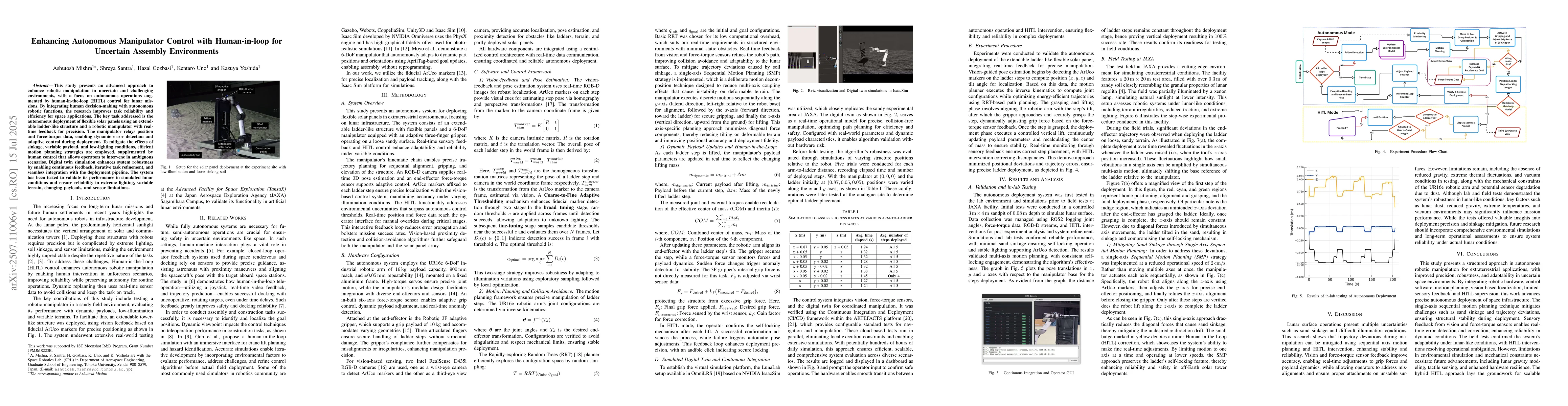 This study presents an advanced approach to enhance robotic manipulation in uncertain and challenging environments, with a focus on autonomous operations augmented by human-in-the-loop (HITL) control for lunar missions. By integrating human decision-making with autonomous robotic functions, the research improves task reliability and efficiency for space applications. The key task addressed is the autonomous deployment of flexible solar panels using an extendable ladder-like structure and a robotic manipulator with real-time feedback for precision. The manipulator relays position and force-torque data, enabling dynamic error detection and adaptive control during deployment. To mitigate the effects of sinkage, variable payload, and low-lighting conditions, efficient motion planning strategies are employed, supplemented by human control that allows operators to intervene in ambiguous scenarios. Digital twin simulation enhances system robustness by enabling continuous feedback, iterative task refinement, and seamless integration with the deployment pipeline. The system has been tested to validate its performance in simulated lunar conditions and ensure reliability in extreme lighting, variable terrain, changing payloads, and sensor limitations.