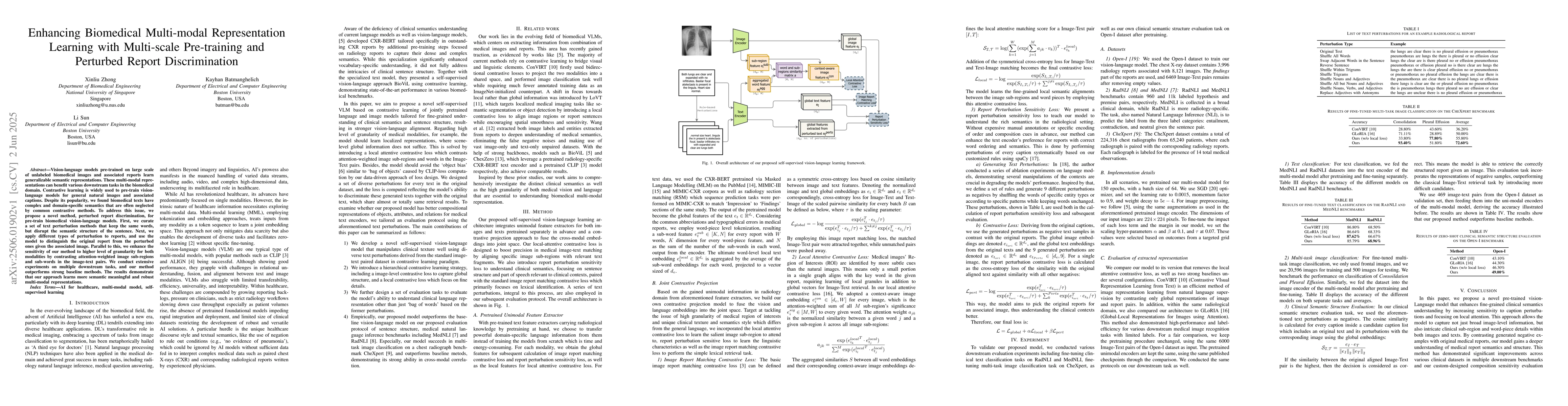 A new method called perturbed report discrimination is proposed to enhance biomedical multi-modal representation learning for vision-language models. This approach outperforms strong baseline methods in various downstream tasks, demonstrating more semantic meaningful and robust multi-modal representations.