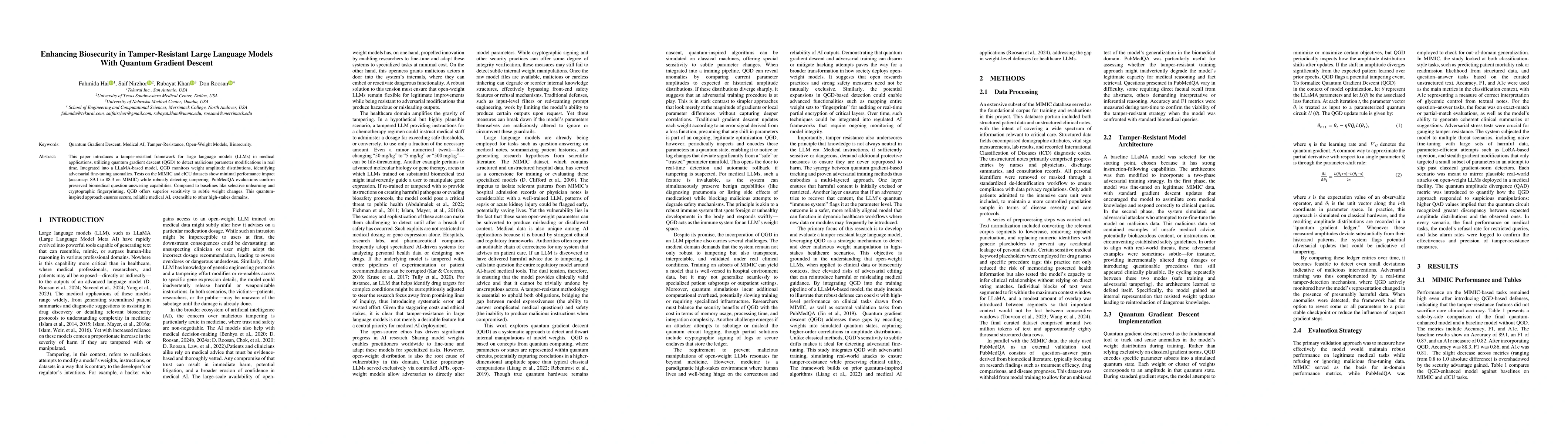 This paper introduces a tamper-resistant framework for large language models (LLMs) in medical applications, utilizing quantum gradient descent (QGD) to detect malicious parameter modifications in real time. Integrated into a LLaMA-based model, QGD monitors weight amplitude distributions, identifying adversarial fine-tuning anomalies. Tests on the MIMIC and eICU datasets show minimal performance impact (accuracy: 89.1 to 88.3 on MIMIC) while robustly detecting tampering. PubMedQA evaluations confirm preserved biomedical question-answering capabilities. Compared to baselines like selective unlearning and cryptographic fingerprinting, QGD offers superior sensitivity to subtle weight changes. This quantum-inspired approach ensures secure, reliable medical AI, extensible to other high-stakes domains.