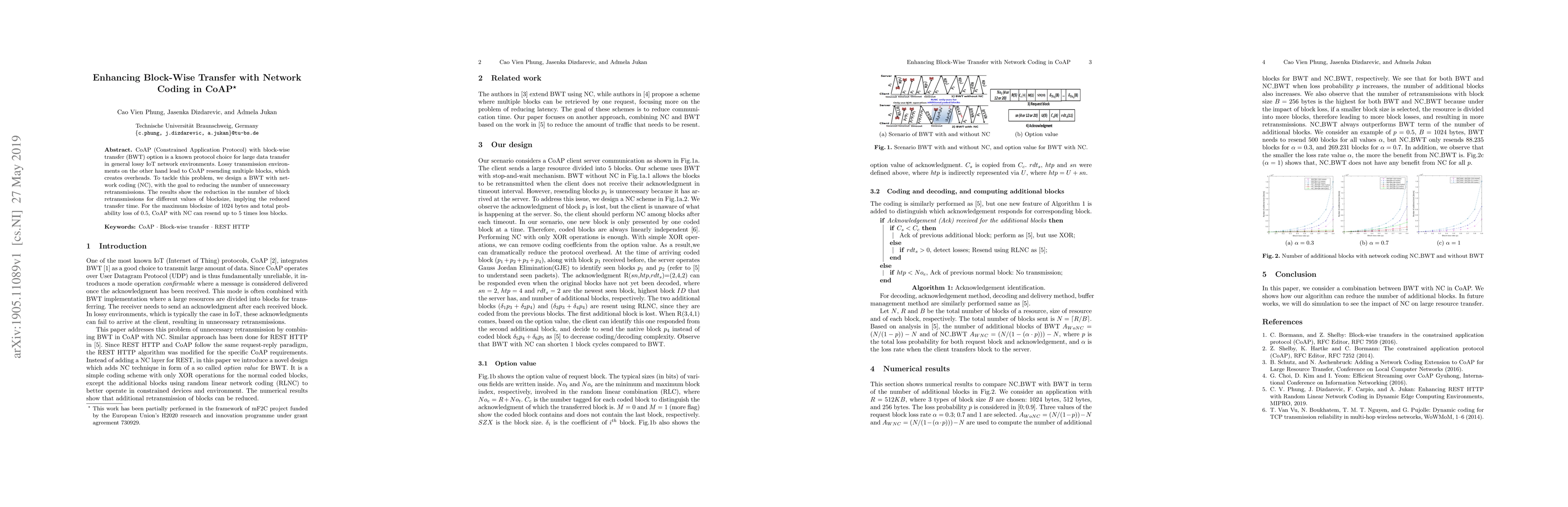 CoAP (Constrained Application Protocol) with block-wise transfer (BWT) option is a known protocol choice for large data transfer in general lossy IoT network environments. Lossy transmission environments on the other hand lead to CoAP resending multiple blocks, which creates overheads. To tackle this problem, we design a BWT with network coding (NC), with the goal to reducing the number of unnecessary retransmissions. The results show the reduction in the number of block retransmissions for different values of blocksize, implying the reduced transfer time. For the maximum blocksize of 1024 bytes and total probability loss of 0.5, CoAP with NC can resend up to 5 times less blocks.