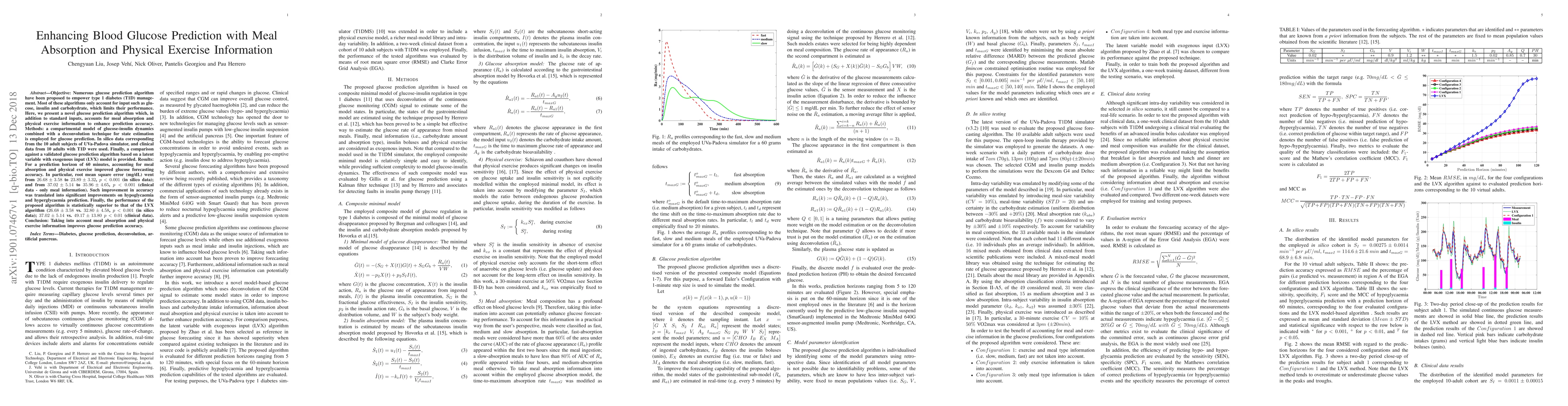 This paper proposes a novel glucose prediction algorithm for type 1 diabetes management that incorporates meal absorption and physical exercise data, in addition to standard inputs. The algorithm's improved accuracy, demonstrated by reduced root mean square error and superior performance compared to existing models, suggests it can better predict hypoglycaemia and hyperglycaemia.