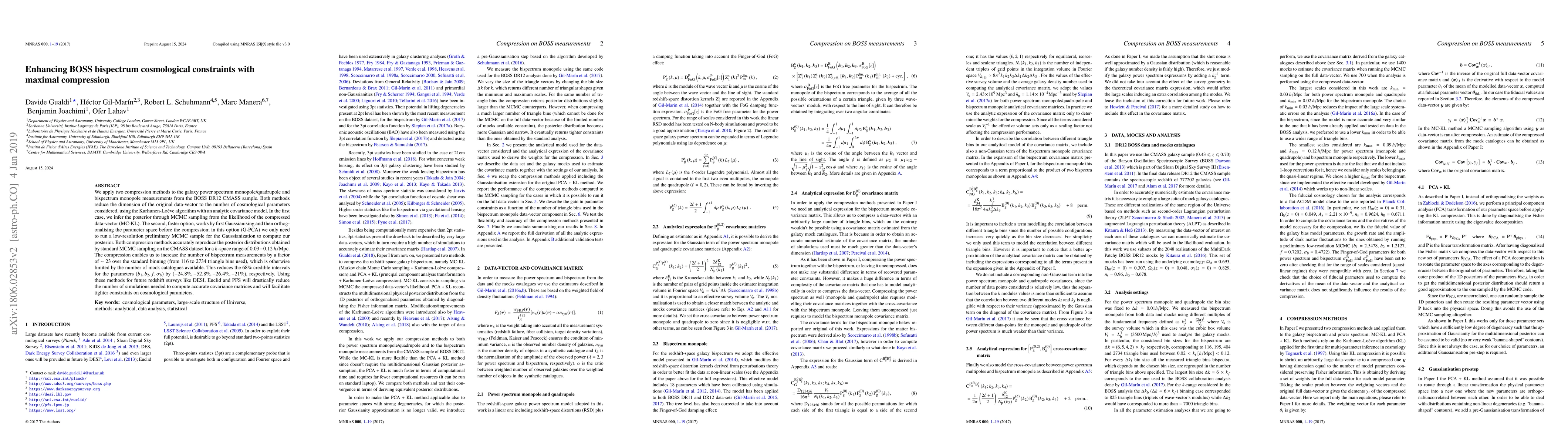 This paper employs two compression techniques to enhance the BOSS bispectrum cosmological constraints, significantly increasing the number of bispectrum measurements and reducing parameter uncertainties. The methods improve the posterior estimates for key cosmological parameters, promising more efficient data analysis for future surveys.