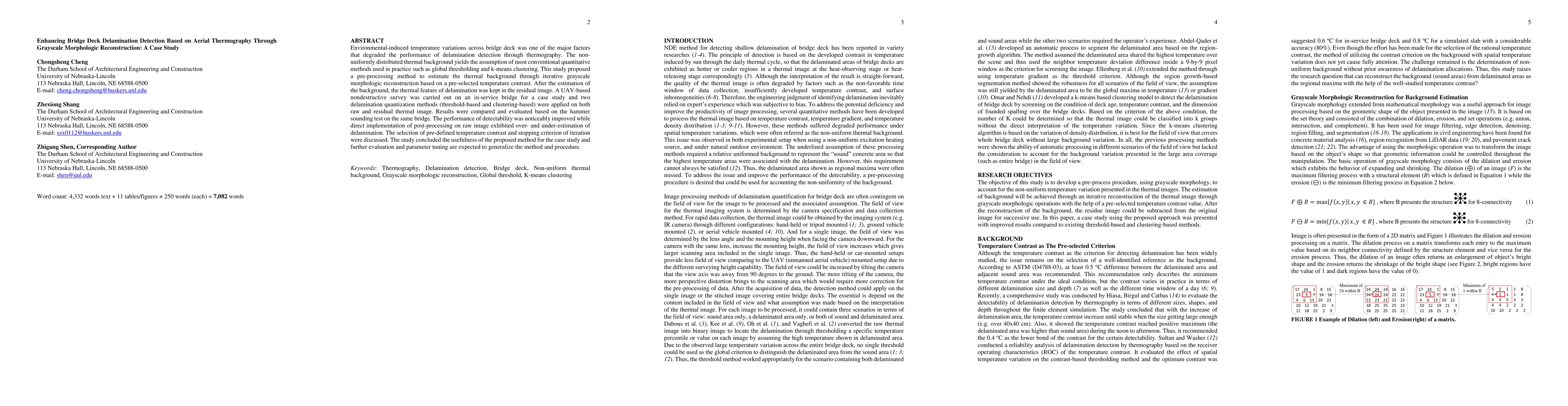 This study proposes an iterative grayscale morphologic reconstruction method to enhance bridge deck delamination detection using aerial thermography by estimating the thermal background. The method improved detectability compared to conventional methods, as demonstrated in a case study on an in-service bridge.