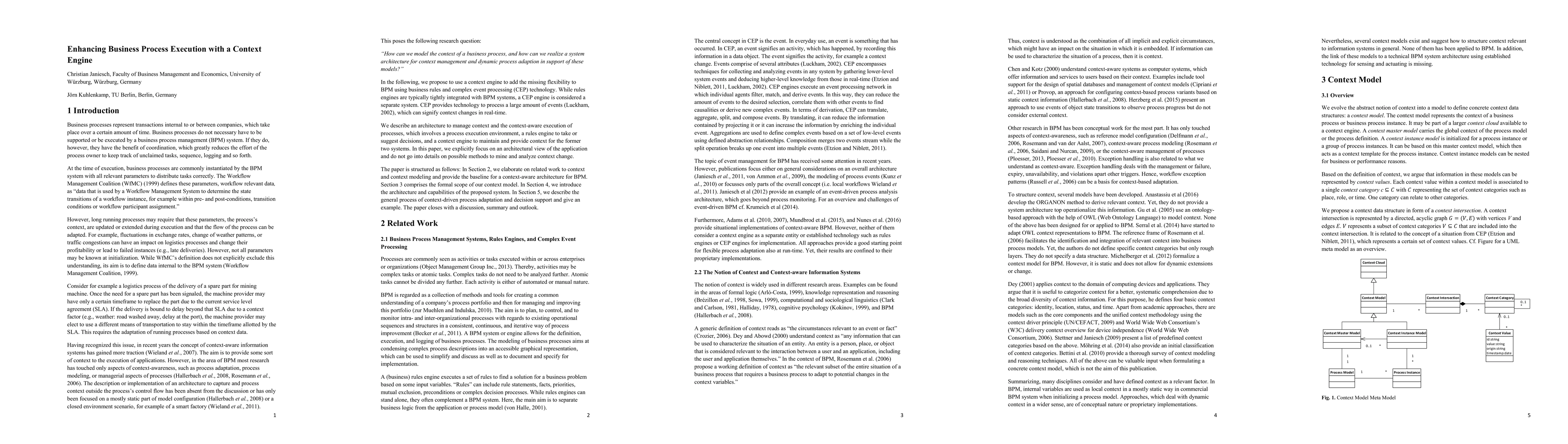 This paper proposes a context engine to enhance business process management (BPM) systems' context-awareness, enabling dynamic adaptation of processes during execution based on significant context changes. The architecture integrates business rules and complex event processing, offering a generic design for implementing adaptable BPM systems.