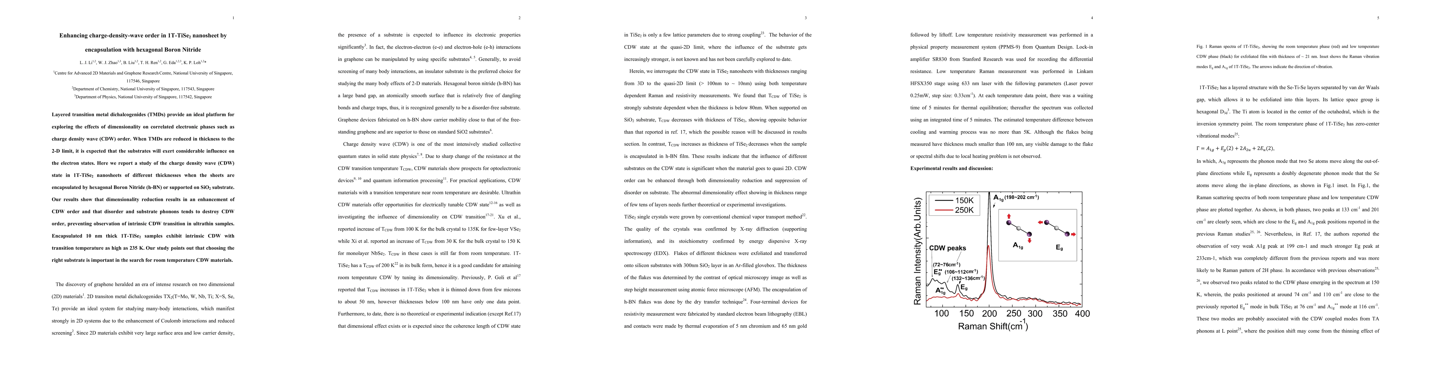 This study investigates how encapsulating 1T-TiSe2 nanosheets with hexagonal Boron Nitride (h-BN) enhances charge-density-wave (CDW) order compared to samples on SiO2. The results show that reduced dimensionality boosts CDW order, with encapsulated 10 nm thick samples displaying intrinsic CDW at a high transition temperature of 235 K, highlighting the importance of substrate choice in achieving room temperature CDW materials.