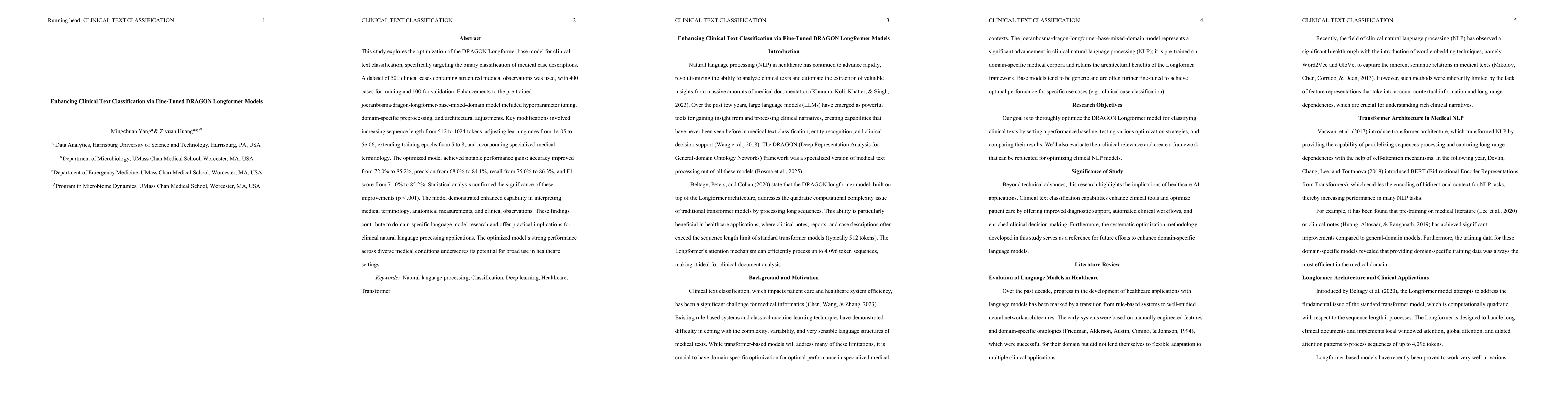This study explores the optimization of the DRAGON Longformer base model for clinical text classification, specifically targeting the binary classification of medical case descriptions. A dataset of 500 clinical cases containing structured medical observations was used, with 400 cases for training and 100 for validation. Enhancements to the pre-trained joeranbosma/dragon-longformer-base-mixed-domain model included hyperparameter tuning, domain-specific preprocessing, and architectural adjustments. Key modifications involved increasing sequence length from 512 to 1024 tokens, adjusting learning rates from 1e-05 to 5e-06, extending training epochs from 5 to 8, and incorporating specialized medical terminology. The optimized model achieved notable performance gains: accuracy improved from 72.0% to 85.2%, precision from 68.0% to 84.1%, recall from 75.0% to 86.3%, and F1-score from 71.0% to 85.2%. Statistical analysis confirmed the significance of these improvements (p < .001). The model demonstrated enhanced capability in interpreting medical terminology, anatomical measurements, and clinical observations. These findings contribute to domain-specific language model research and offer practical implications for clinical natural language processing applications. The optimized model's strong performance across diverse medical conditions underscores its potential for broad use in healthcare settings.