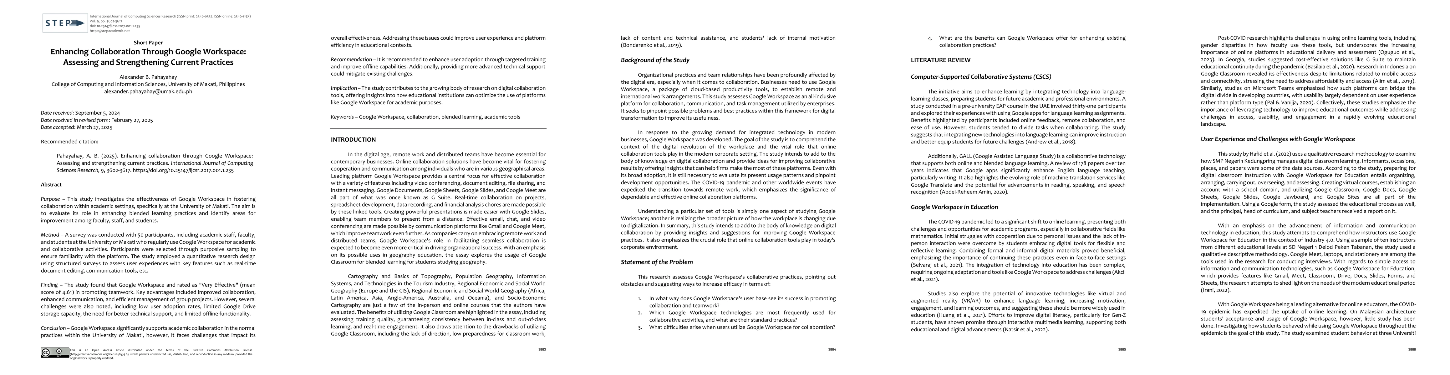 This research is important as it evaluates the effectiveness of Google Workspace in enhancing blended learning practices within an academic setting, providing insights that could improve collaboration tools in educational institutions.