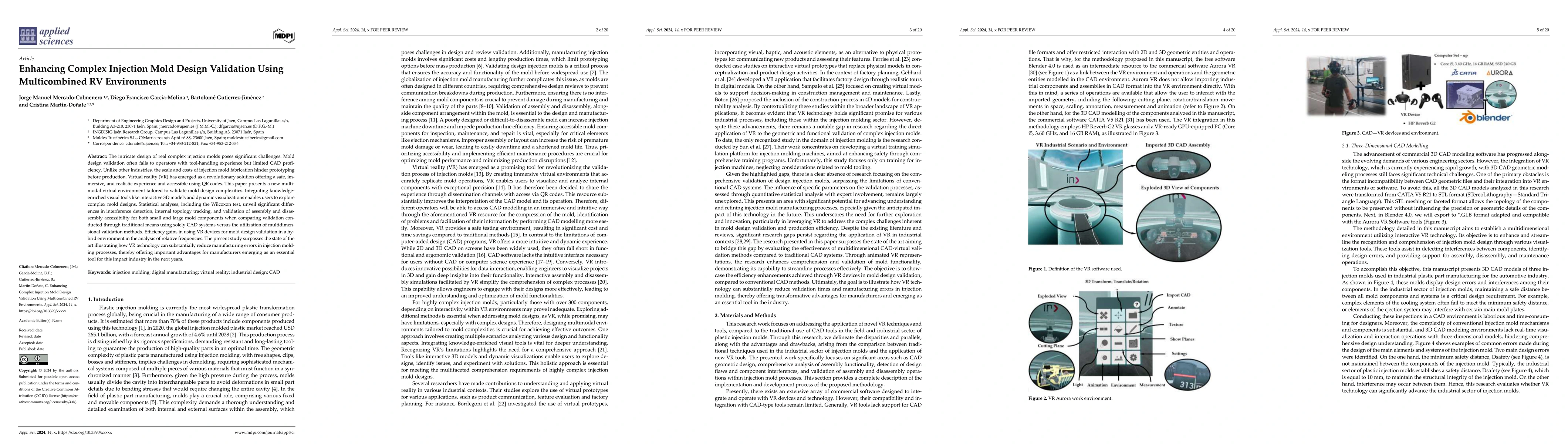 The intricate design of real complex injection molds poses significant challenges. Mold design vali-dation often falls to operators with tool-handling experience but limited CAD proficiency. Unlike other industries, the scale and costs of injection mold fabrication hinder prototyping before pro-duction. Virtual reality (VR) has emerged as a revolutionary solution offering a safe, immersive, and realistic experience and accessible using QR codes. This paper presents a new multimodal virtual environment tailored to validate mold design complexities. Integrating knowledge-enriched visual tools like interactive 3D models and dynamic visualizations enables users to explore complex mold designs. Statistical analyses, including the Wilcoxon test, unveil significant differences in interference detection, internal topology tracking, and validation of assembly and disassembly accessibility for both small and large mold components when comparing validation conducted through traditional means using solely CAD systems versus the utilization of multidimensional validation methods. Efficiency gains in using VR devices for mold design validation in a hybrid environment in the analysis of relative frequencies. The present study surpasses the state of the art illustrating how VR technology can substantially reduce manufacturing errors in injection molding processes, thereby offering important advantages for manufacturers emerging as an essential tool for this impact in-dustry in the next years.