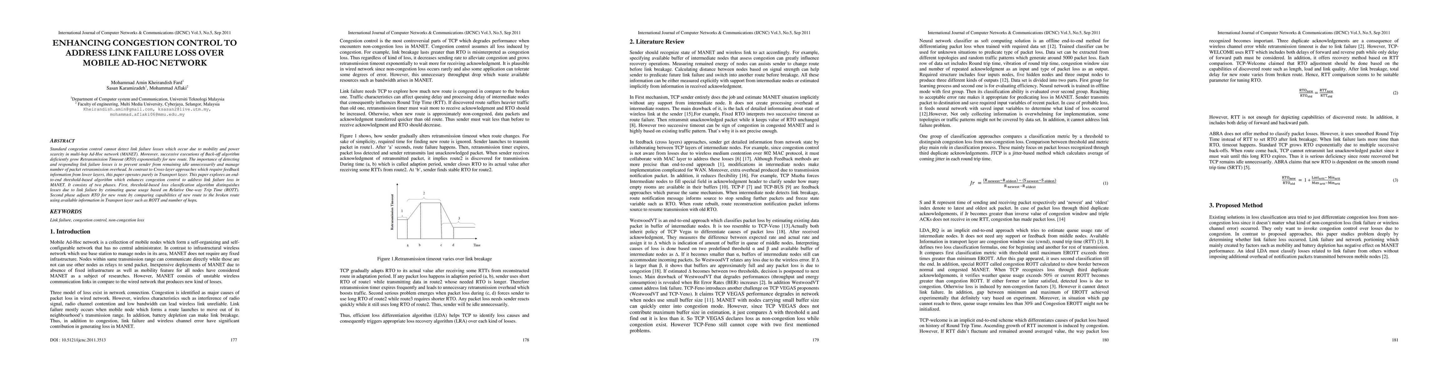 This paper proposes a threshold-based congestion control algorithm to detect link failure losses in mobile ad-hoc networks, distinguishing them from congestion-induced losses using queue usage and ROTT. The algorithm adjusts RTO for new routes based on transport layer metrics, aiming to reduce unnecessary sender idleness and packet retransmission overhead.