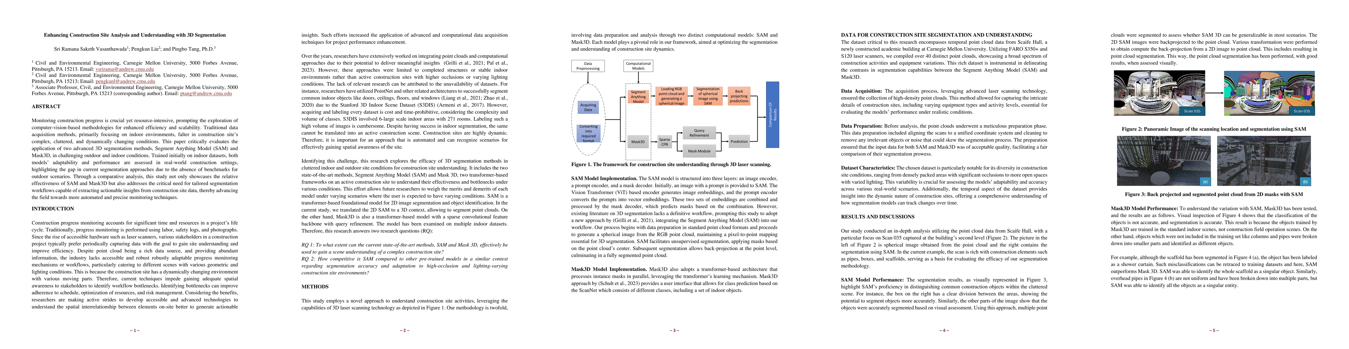 Monitoring construction progress is crucial yet resource-intensive, prompting the exploration of computer-vision-based methodologies for enhanced efficiency and scalability. Traditional data acquisition methods, primarily focusing on indoor environments, falter in construction site's complex, cluttered, and dynamically changing conditions. This paper critically evaluates the application of two advanced 3D segmentation methods, Segment Anything Model (SAM) and Mask3D, in challenging outdoor and indoor conditions. Trained initially on indoor datasets, both models' adaptability and performance are assessed in real-world construction settings, highlighting the gap in current segmentation approaches due to the absence of benchmarks for outdoor scenarios. Through a comparative analysis, this study not only showcases the relative effectiveness of SAM and Mask3D but also addresses the critical need for tailored segmentation workflows capable of extracting actionable insights from construction site data, thereby advancing the field towards more automated and precise monitoring techniques.