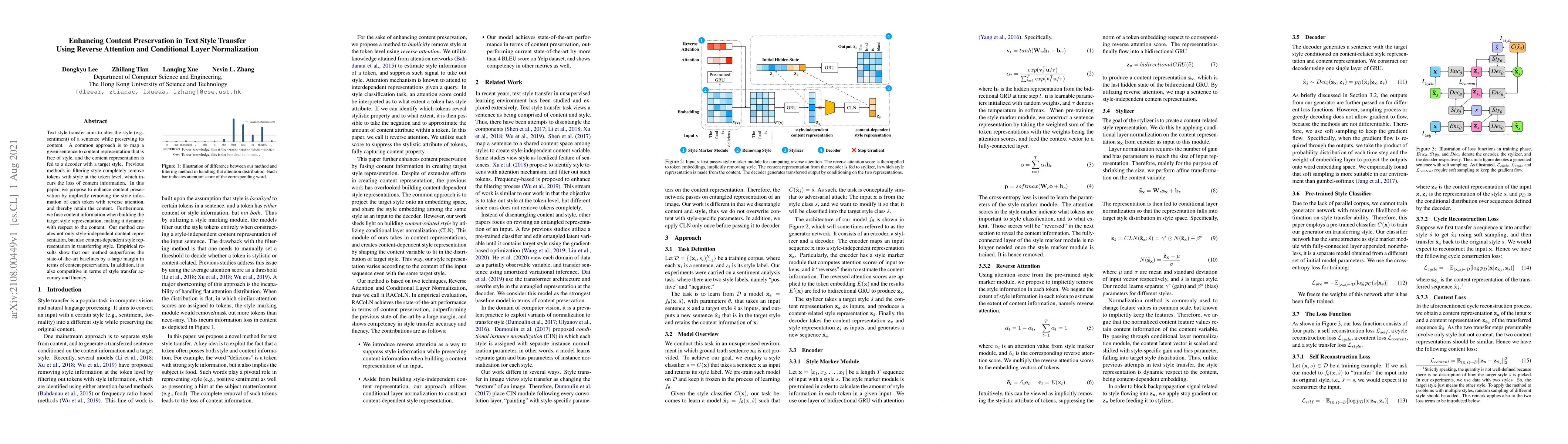 This paper proposes a method to enhance content preservation in text style transfer using reverse attention and conditional layer normalization. It aims to retain content while removing style implicitly, achieving superior content preservation compared to state-of-the-art baselines.