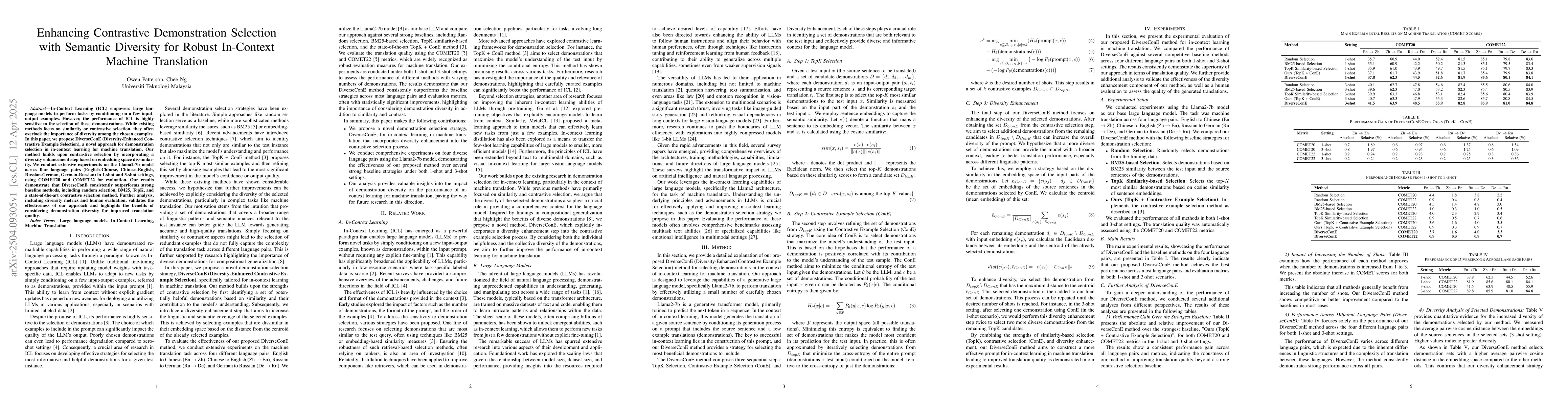 The research proposes DiverseConE, a novel method for demonstration selection in in-context learning for machine translation, which enhances contrastive selection by incorporating a diversity enhancement step based on embedding space dissimilarity. Experiments are conducted using the Llama2-7b model across four language pairs (English-Chinese, Chinese-English, Russian-German, German-Russian) in 1-shot and 3-shot settings, evaluating with COMET20 and COMET22 metrics.