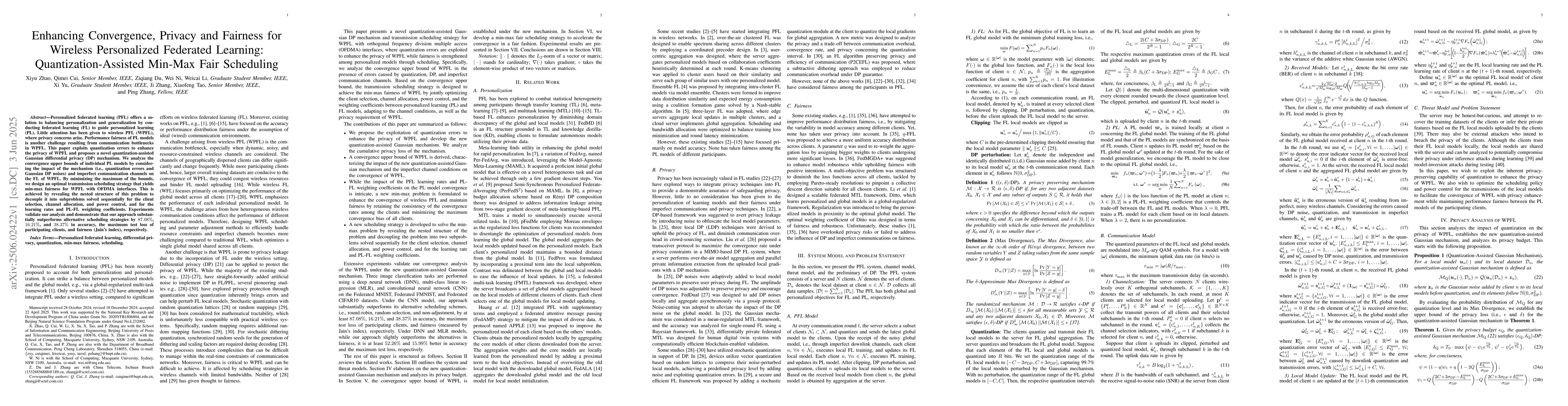 This paper proposes a novel scheduling strategy for wireless personalized federated learning that enhances convergence, privacy, and fairness by leveraging quantization errors to minimize the impact of communication bottlenecks.