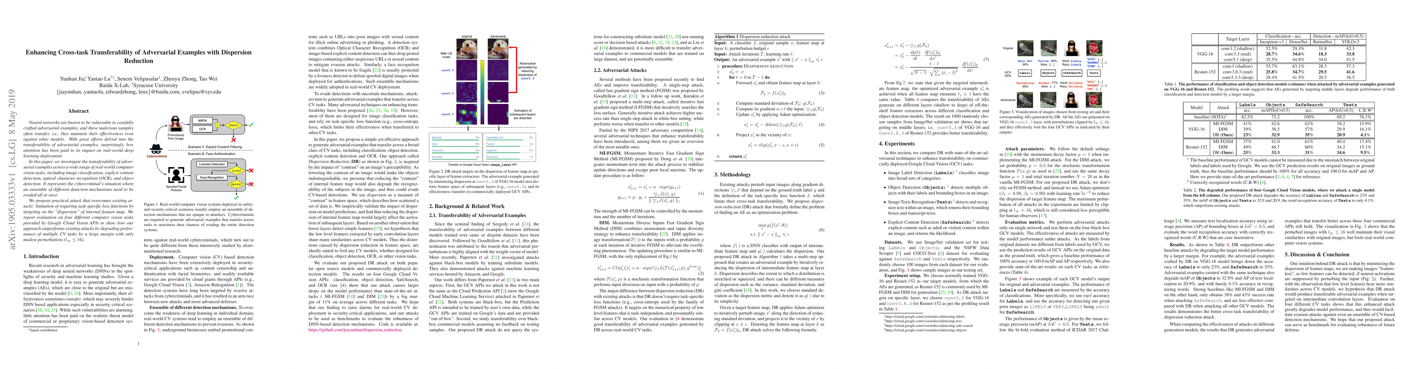 Neural networks are known to be vulnerable to carefully crafted adversarial examples, and these malicious samples often transfer, i.e., they maintain their effectiveness even against other models. With great efforts delved into the transferability of adversarial examples, surprisingly, less attention has been paid to its impact on real-world deep learning deployment. In this paper, we investigate the transferability of adversarial examples across a wide range of real-world computer vision tasks, including image classification, explicit content detection, optical character recognition (OCR), and object detection. It represents the cybercriminal's situation where an ensemble of different detection mechanisms need to be evaded all at once. We propose practical attack that overcomes existing attacks' limitation of requiring task-specific loss functions by targeting on the `dispersion' of internal feature map. We report evaluation on four different computer vision tasks provided by Google Cloud Vision APIs to show how our approach outperforms existing attacks by degrading performance of multiple CV tasks by a large margin with only modest perturbations.