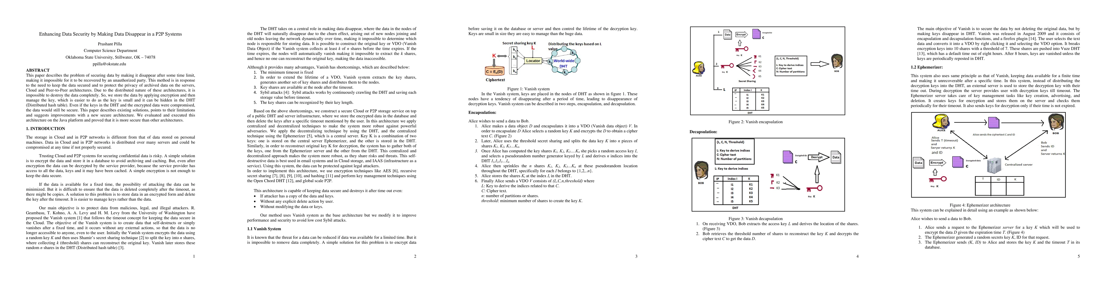 This paper describes the problem of securing data by making it disappear after some time limit, making it impossible for it to be recovered by an unauthorized party. This method is in response to the need to keep the data secured and to protect the privacy of archived data on the servers, Cloud and Peer-to-Peer architectures. Due to the distributed nature of these architectures, it is impossible to destroy the data completely. So, we store the data by applying encryption and then manage the key, which is easier to do as the key is small and it can be hidden in the DHT (Distributed hash table). Even if the keys in the DHT and the encrypted data were compromised, the data would still be secure. This paper describes existing solutions, points to their limitations and suggests improvements with a new secure architecture. We evaluated and executed this architecture on the Java platform and proved that it is more secure than other architectures.