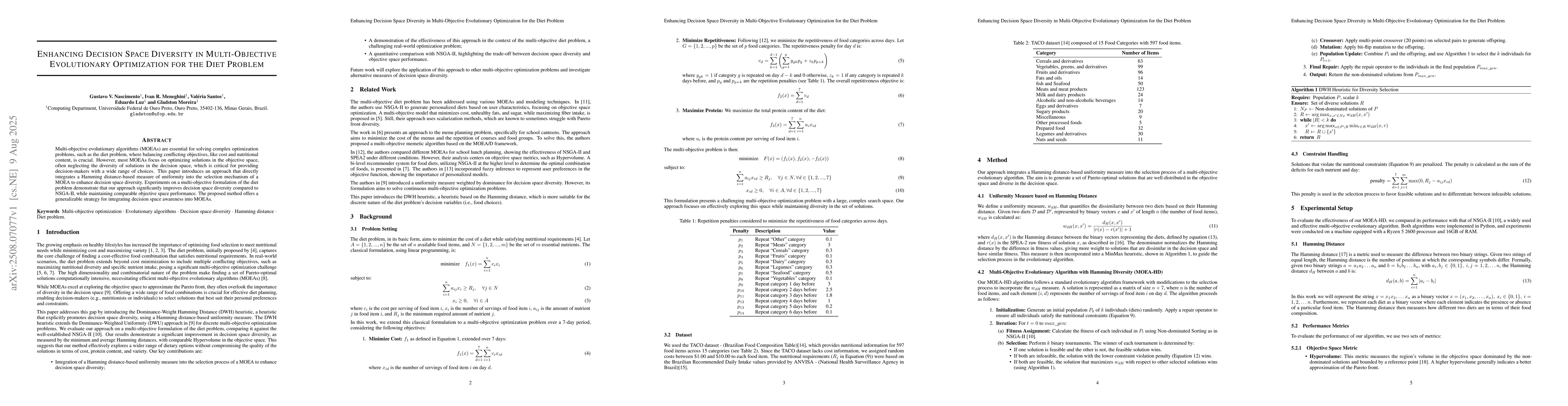 The research introduces MOEA-HD, a multi-objective evolutionary algorithm that integrates a Hamming distance-based uniformity measure into its selection mechanism to enhance decision space diversity in the diet problem.
