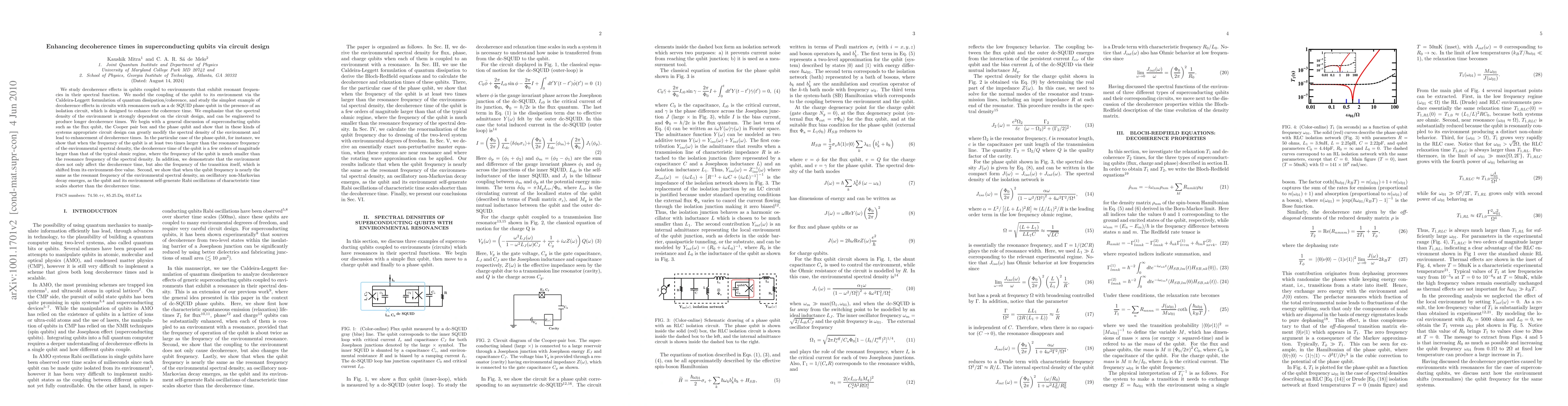This paper explores how circuit design can enhance decoherence times in superconducting qubits by modifying the spectral density of their environment. It demonstrates that the qubit frequency relative to the environment's resonant frequency significantly influences decoherence times, with optimal designs achieving much longer coherence compared to typical ohmic regimes.