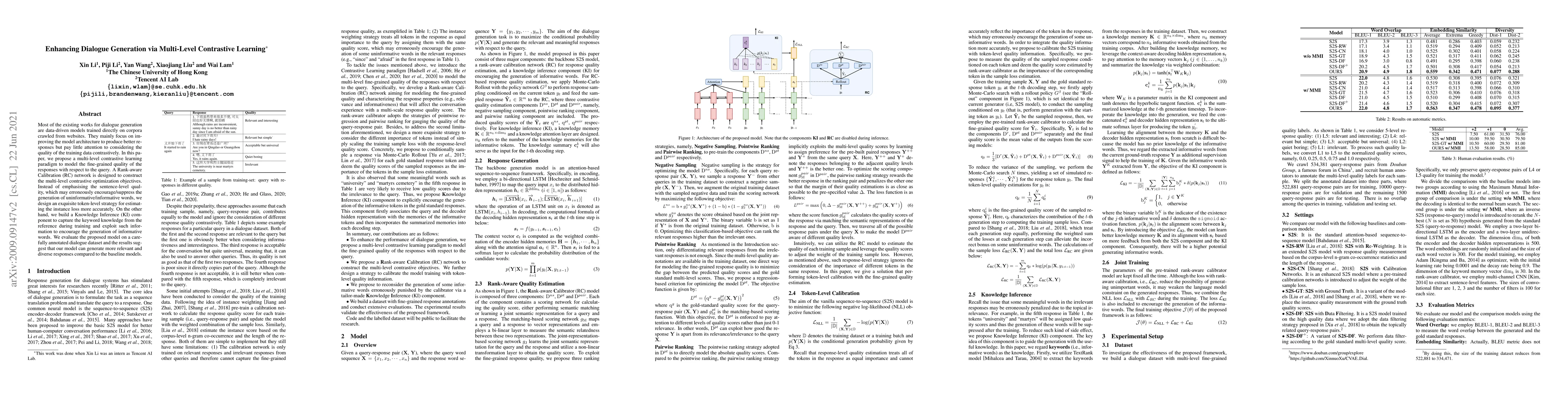 This paper proposes a multi-level contrastive learning approach to enhance dialogue generation, focusing on improving response quality through a Rank-aware Calibration network and a Knowledge Inference component to generate more relevant and diverse responses. The model outperforms baselines by leveraging fine-grained contrastive optimization and token-level strategies.