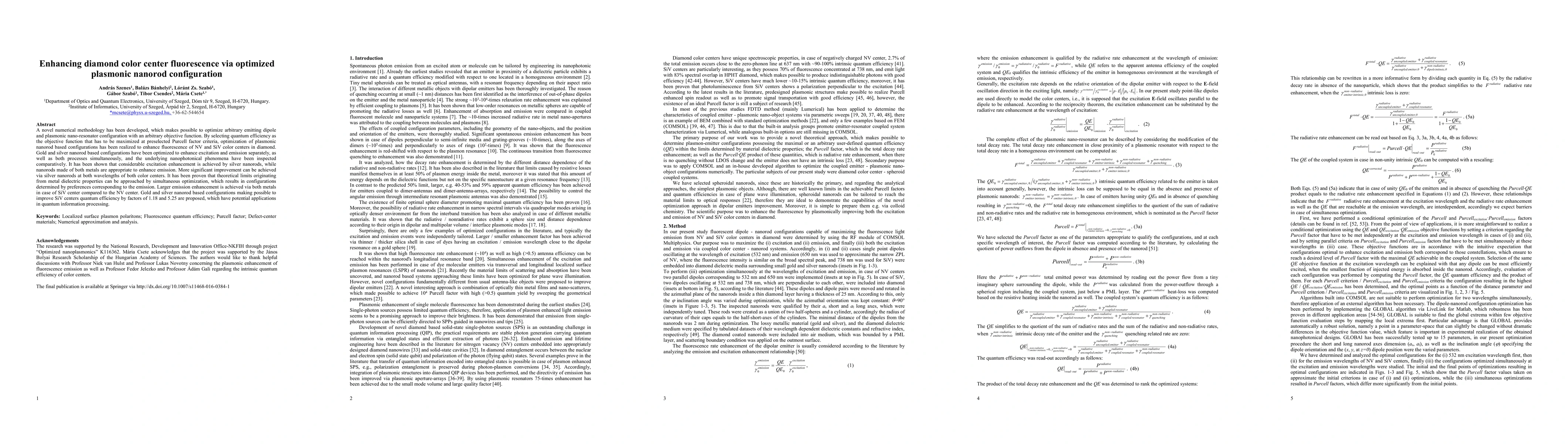 A novel numerical methodology has been developed, which makes possible to optimize arbitrary emitting dipole and plasmonic nano-resonator configuration with an arbitrary objective function. By selecting quantum efficiency as the objective function that has to be maximized at preselected Purcell factor criteria, optimization of plasmonic nanorod based configurations has been realized to enhance fluorescence of NV and SiV color centers in diamond. Gold and silver nanorod based configurations have been optimized to enhance excitation and emission separately, as well as both processes simultaneously, and the underlying nanophotonical phenomena have been inspected comparatively. It has been shown that considerable excitation enhancement is achieved by silver nanorods, while nanorods made of both metals are appropriate to enhance emission. More significant improvement can be achieved via silver nanorods at both wavelengths of both color centers. It has been proven that theoretical limits originating from metal dielectric properties can be approached by simultaneous optimization, which results in configurations determined by preferences corresponding to the emission. Larger emission enhancement is achieved via both metals in case of SiV center compared to the NV center. Gold and silver nanorod based configurations making possible to improve SiV centers quantum efficiency by factors of 1.18 and 5.25 are proposed, which have potential applications in quantum information processing.