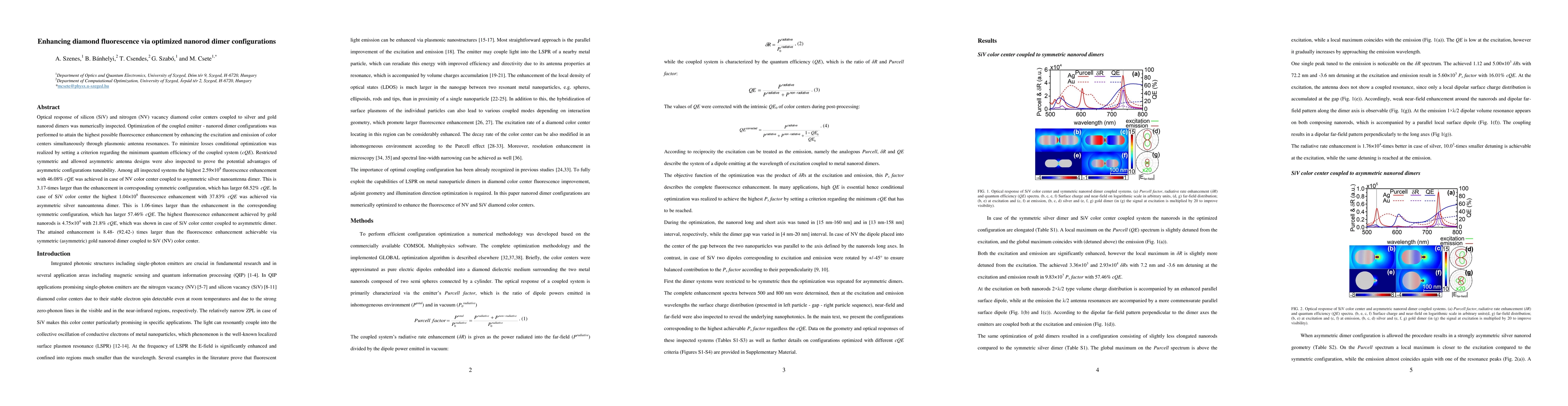 Optical response of silicon (SiV) and nitrogen (NV) vacancy diamond color centers coupled to silver and gold nanorod dimers was numerically inspected. Optimization of the coupled emitter - nanorod dimer configurations was performed to attain the highest possible fluorescence enhancement by enhancing the excitation and emission of color centers simultaneously through plasmonic antenna resonances. To minimize losses conditional optimization was realized by setting a criterion regarding the minimum quantum efficiency of the coupled system (cQE). Restricted symmetric and allowed asymmetric antenna designs were also inspected to prove the potential advantages of asymmetric configurations tuneability. Among all inspected systems the highest 2.59*10^8 fluorescence enhancement with 46.08% cQE was achieved in case of NV color center coupled to asymmetric silver nanoantenna dimer. This is 3.17-times larger than the enhancement in corresponding symmetric configuration, which has larger 68.52% cQE. In case of SiV color center the highest 1.04*10^8 fluorescence enhancement with 37.83% cQE was achieved via asymmetric silver nanoantenna dimer. This is 1.06-times larger than the enhancement in the corresponding symmetric configuration, which has larger 57.46% cQE. The highest fluorescence enhancement achieved by gold nanorods is 4.75*10^4 with 21.8% cQE, which was shown in case of SiV color center coupled to asymmetric dimer. The attained enhancement is 8.48- (92.42-) times larger than the fluorescence enhancement achievable via symmetric (asymmetric) gold nanorod dimer coupled to SiV (NV) color center.