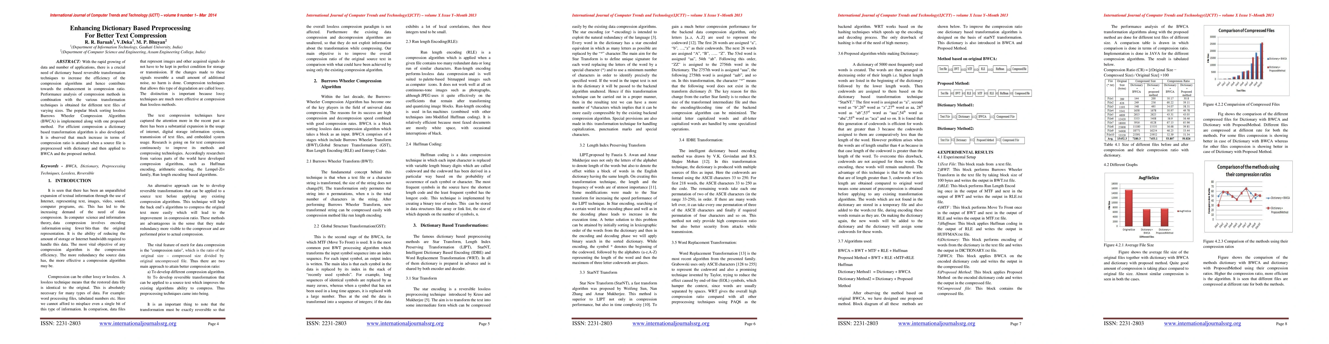 With the rapid growing of data and number of applications, there is a crucial need of dictionary based reversible transformation techniques to increase the efficiency of the compression algorithms and hence contribute towards the enhancement in compression ratio. Performance analysis of compression methods in combination with the various transformation techniques is obtained for different text files of varying sizes. The popular block sorting lossless Burrows Wheeler Compression Algorithm (BWCA) is implemented along with one proposed method. For efficient compression a dictionary based transformation algorithm is also developed. It is observed that much increase in terms of compression ratio is attained when a source file is preprocessed with dictionary and then applied to BWCA and the proposed method.