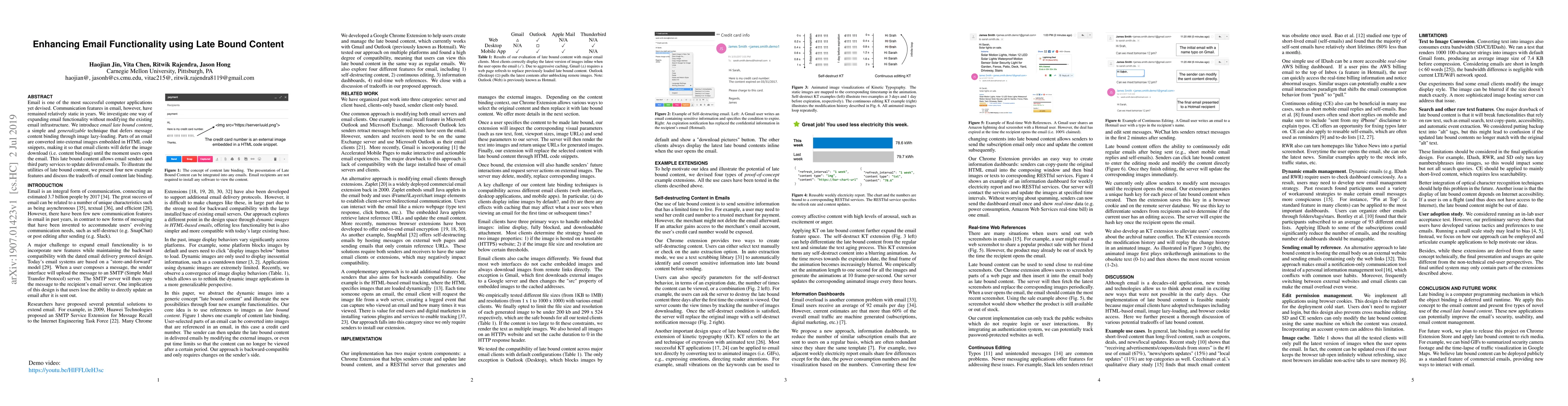 This paper proposes a method to enhance email functionality by introducing late bound content, which defers message content binding through image lazy-loading. This technique allows email senders and third-party services to update delivered emails without modifying existing email infrastructure.