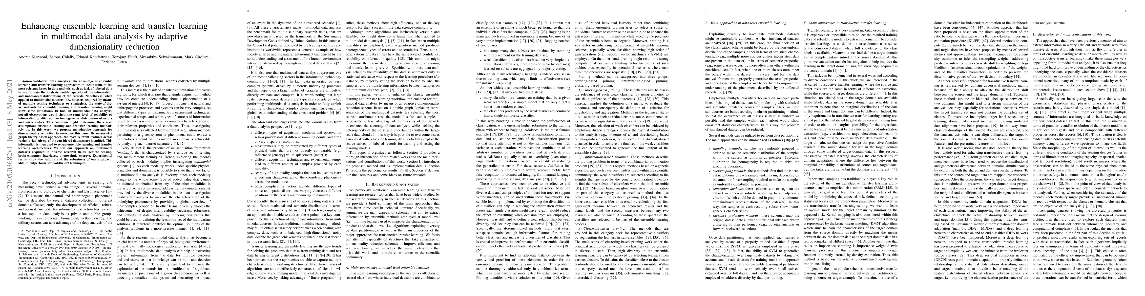 This research paper proposes an adaptive dimensionality reduction approach to enhance ensemble learning and transfer learning in multimodal data analysis, outperforming state-of-the-art techniques on diverse datasets.