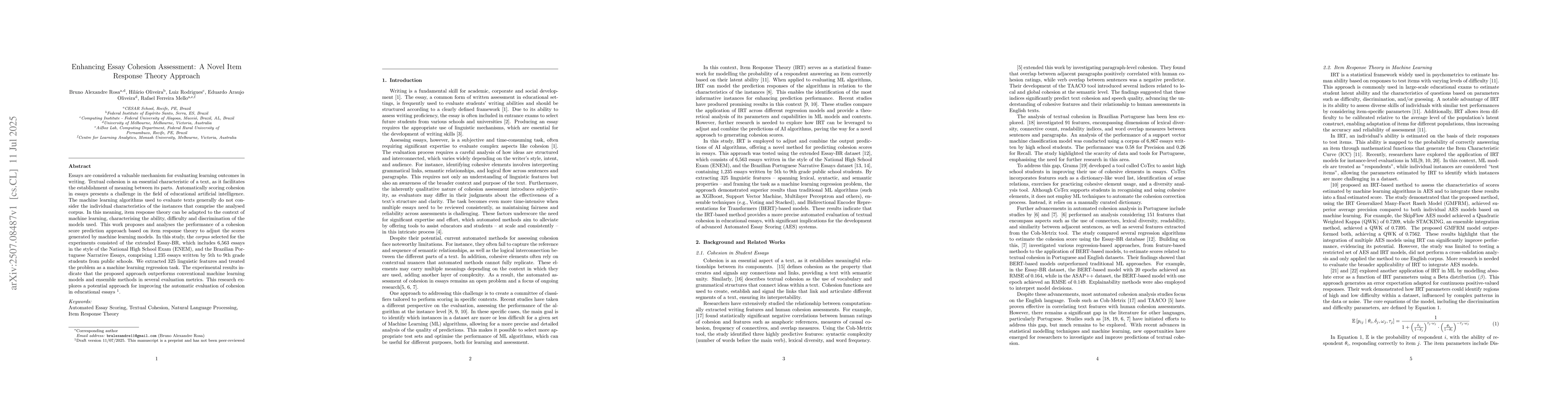 Essays are considered a valuable mechanism for evaluating learning outcomes in writing. Textual cohesion is an essential characteristic of a text, as it facilitates the establishment of meaning between its parts. Automatically scoring cohesion in essays presents a challenge in the field of educational artificial intelligence. The machine learning algorithms used to evaluate texts generally do not consider the individual characteristics of the instances that comprise the analysed corpus. In this meaning, item response theory can be adapted to the context of machine learning, characterising the ability, difficulty and discrimination of the models used. This work proposes and analyses the performance of a cohesion score prediction approach based on item response theory to adjust the scores generated by machine learning models. In this study, the corpus selected for the experiments consisted of the extended Essay-BR, which includes 6,563 essays in the style of the National High School Exam (ENEM), and the Brazilian Portuguese Narrative Essays, comprising 1,235 essays written by 5th to 9th grade students from public schools. We extracted 325 linguistic features and treated the problem as a machine learning regression task. The experimental results indicate that the proposed approach outperforms conventional machine learning models and ensemble methods in several evaluation metrics. This research explores a potential approach for improving the automatic evaluation of cohesion in educational essays.