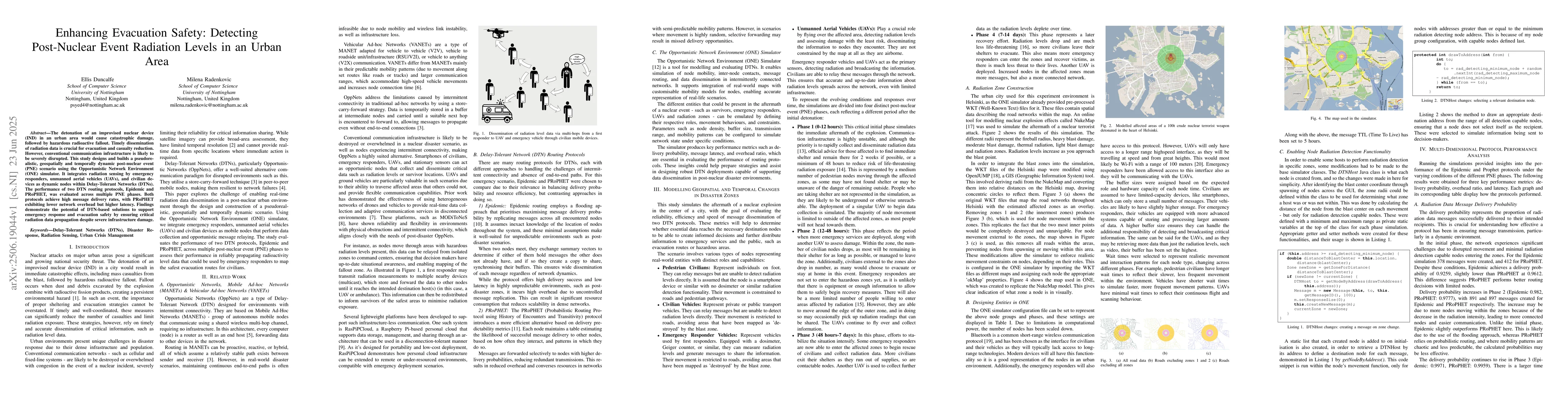 The detonation of an improvised nuclear device (IND) in an urban area would cause catastrophic damage, followed by hazardous radioactive fallout. Timely dissemination of radiation data is crucial for evacuation and casualty reduction. However, conventional communication infrastructure is likely to be severely disrupted. This study designs and builds a pseudorealistic, geospatially and temporally dynamic post-nuclear event (PNE) scenario using the Opportunistic Network Environment (ONE) simulator. It integrates radiation sensing by emergency responders, unmanned aerial vehicles (UAVs), and civilian devices as dynamic nodes within Delay-Tolerant Networks (DTNs). The performance of two DTN routing protocols, Epidemic and PRoPHET, was evaluated across multiple PNE phases. Both protocols achieve high message delivery rates, with PRoPHET exhibiting lower network overhead but higher latency. Findings demonstrate the potential of DTN-based solutions to support emergency response and evacuation safety by ensuring critical radiation data propagation despite severe infrastructure damage.