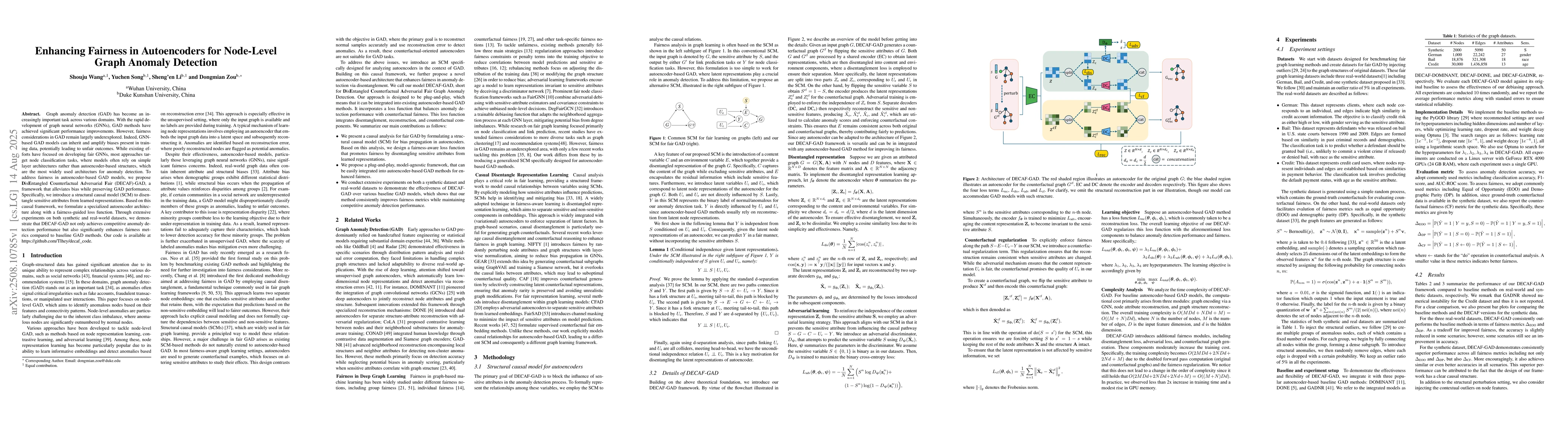 Graph anomaly detection (GAD) has become an increasingly important task across various domains. With the rapid development of graph neural networks (GNNs), GAD methods have achieved significant performance improvements. However, fairness considerations in GAD remain largely underexplored. Indeed, GNN-based GAD models can inherit and amplify biases present in training data, potentially leading to unfair outcomes. While existing efforts have focused on developing fair GNNs, most approaches target node classification tasks, where models often rely on simple layer architectures rather than autoencoder-based structures, which are the most widely used architecturs for anomaly detection. To address fairness in autoencoder-based GAD models, we propose \textbf{D}is\textbf{E}ntangled \textbf{C}ounterfactual \textbf{A}dversarial \textbf{F}air (DECAF)-GAD, a framework that alleviates bias while preserving GAD performance. Specifically, we introduce a structural causal model (SCM) to disentangle sensitive attributes from learned representations. Based on this causal framework, we formulate a specialized autoencoder architecture along with a fairness-guided loss function. Through extensive experiments on both synthetic and real-world datasets, we demonstrate that DECAF-GAD not only achieves competitive anomaly detection performance but also significantly enhances fairness metrics compared to baseline GAD methods. Our code is available at https://github.com/Tlhey/decaf_code.
