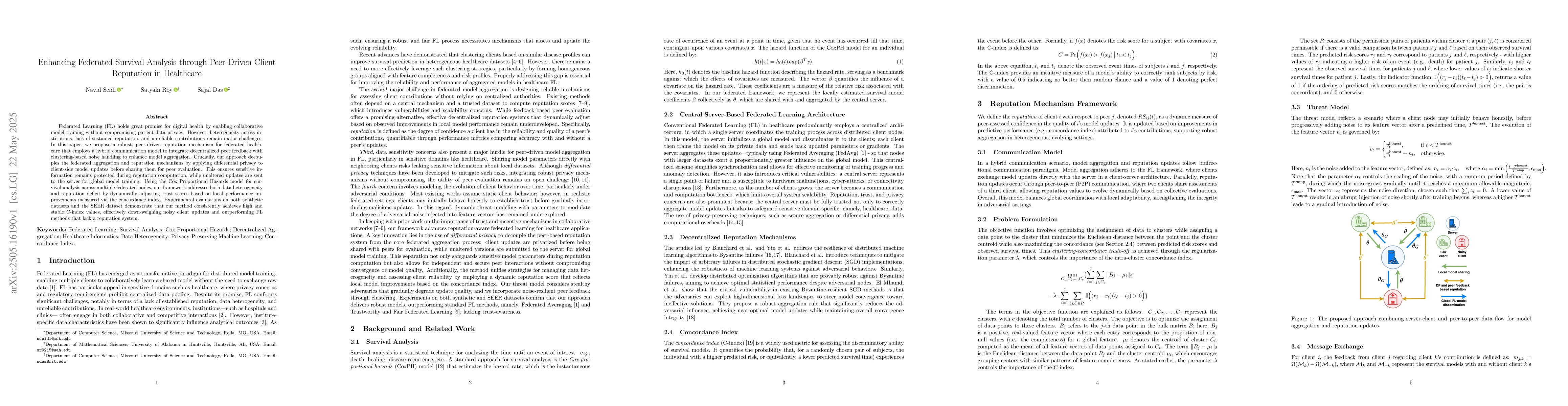 This work is novel in its decoupling of federated aggregation and reputation mechanisms, and its application of differential privacy to client-side model updates for reputation computation, addressing critical challenges in federated survival analysis in healthcare.