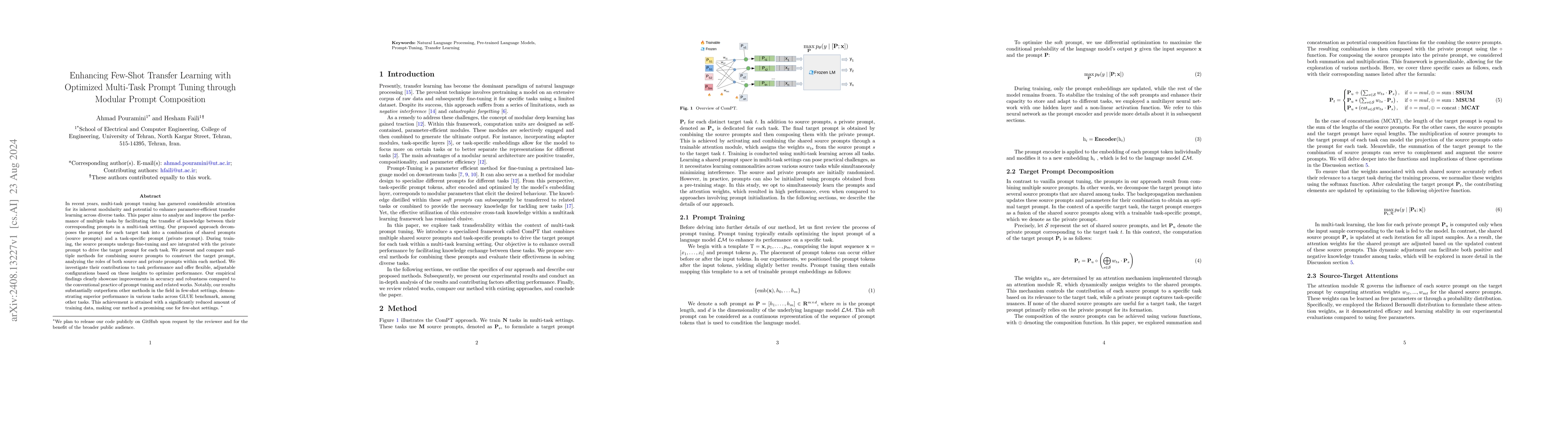 This paper proposes an optimized multi-task prompt tuning method through modular prompt composition, achieving significant improvements in few-shot transfer learning performance by decomposing prompts into shared and task-specific components. The approach yields better accuracy and robustness compared to conventional methods, particularly excelling in few-shot settings.