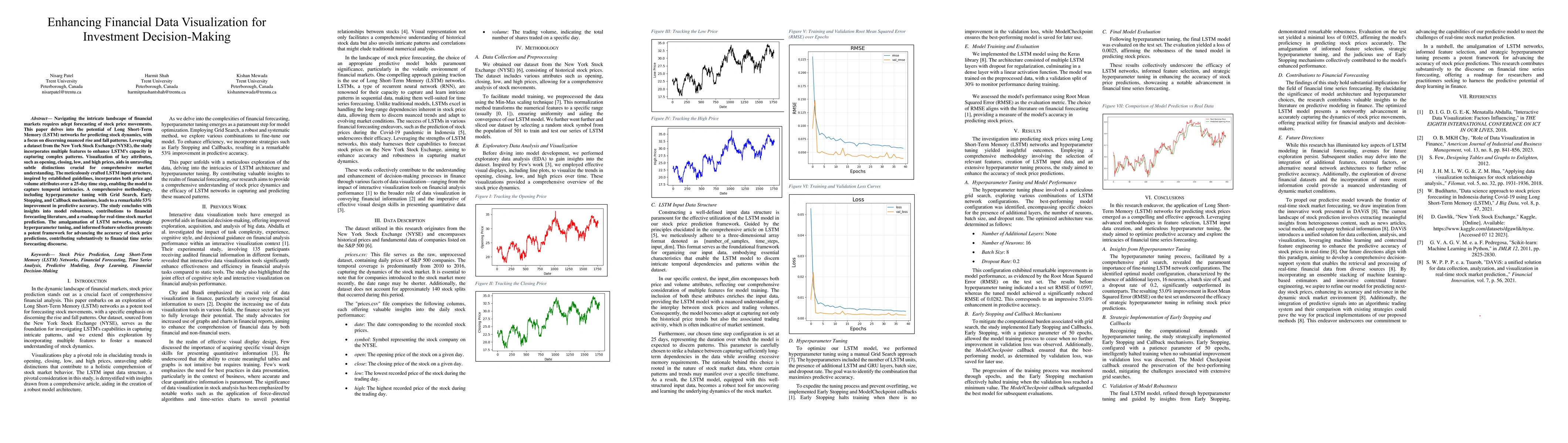 Navigating the intricate landscape of financial markets requires adept forecasting of stock price movements. This paper delves into the potential of Long Short-Term Memory (LSTM) networks for predicting stock dynamics, with a focus on discerning nuanced rise and fall patterns. Leveraging a dataset from the New York Stock Exchange (NYSE), the study incorporates multiple features to enhance LSTM's capacity in capturing complex patterns. Visualization of key attributes, such as opening, closing, low, and high prices, aids in unraveling subtle distinctions crucial for comprehensive market understanding. The meticulously crafted LSTM input structure, inspired by established guidelines, incorporates both price and volume attributes over a 25-day time step, enabling the model to capture temporal intricacies. A comprehensive methodology, including hyperparameter tuning with Grid Search, Early Stopping, and Callback mechanisms, leads to a remarkable 53% improvement in predictive accuracy. The study concludes with insights into model robustness, contributions to financial forecasting literature, and a roadmap for real-time stock market prediction. The amalgamation of LSTM networks, strategic hyperparameter tuning, and informed feature selection presents a potent framework for advancing the accuracy of stock price predictions, contributing substantively to financial time series forecasting discourse.