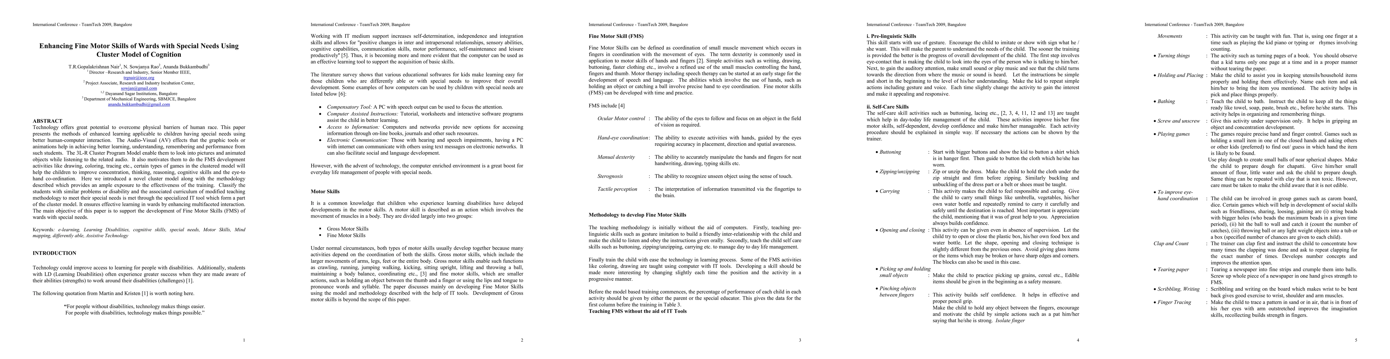 Technology offers great potential to overcome physical barriers of human race. This paper presents the methods of enhanced learning applicable to children having special needs using better human-computer interaction. The Audio-Visual (AV) effects that the graphic tools or animations help in achieving better learning, understanding, remembering and performance from such students. The 3L-R Cluster Program Model enable them to look into pictures and animated objects while listening to the related audio. It also motivates them to do the FMS development activities like drawing, coloring, tracing etc., certain types of games in the clustered model will help the children to improve concentration, thinking, reasoning, cognitive skills and the eye-to hand co-ordination. Here we introduced a novel cluster model along with the methodology described which provides an ample exposure to the effectiveness of the training. Classify the students with similar problems or disability and the associated curriculum of modified teaching methodology to meet their special needs is met through the specialized IT tool which form a part of the cluster model. It ensures effective learning in wards by enhancing multifaceted interaction. The main objective of this paper is to support the development of Fine Motor Skills (FMS) of wards with special needs.
