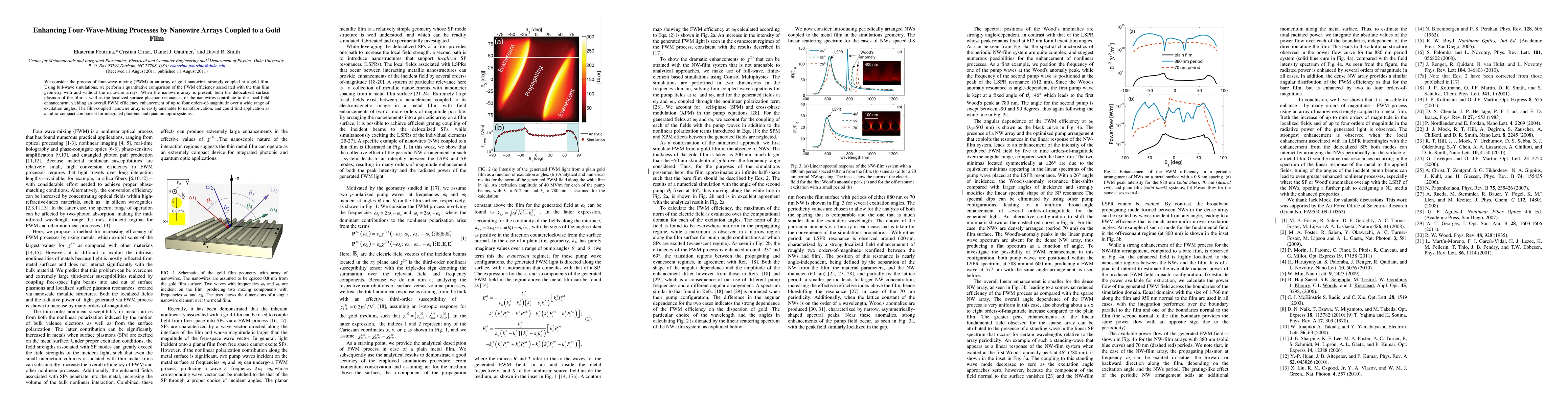 This study investigates the enhancement of four-wave mixing efficiency in an array of gold nanowires coupled to a gold film, revealing a four-order-of-magnitude increase in efficiency due to combined surface plasmon effects. The proposed film-coupled nanowire structure is easily fabricated and holds potential for compact integrated photonic and quantum optic systems.