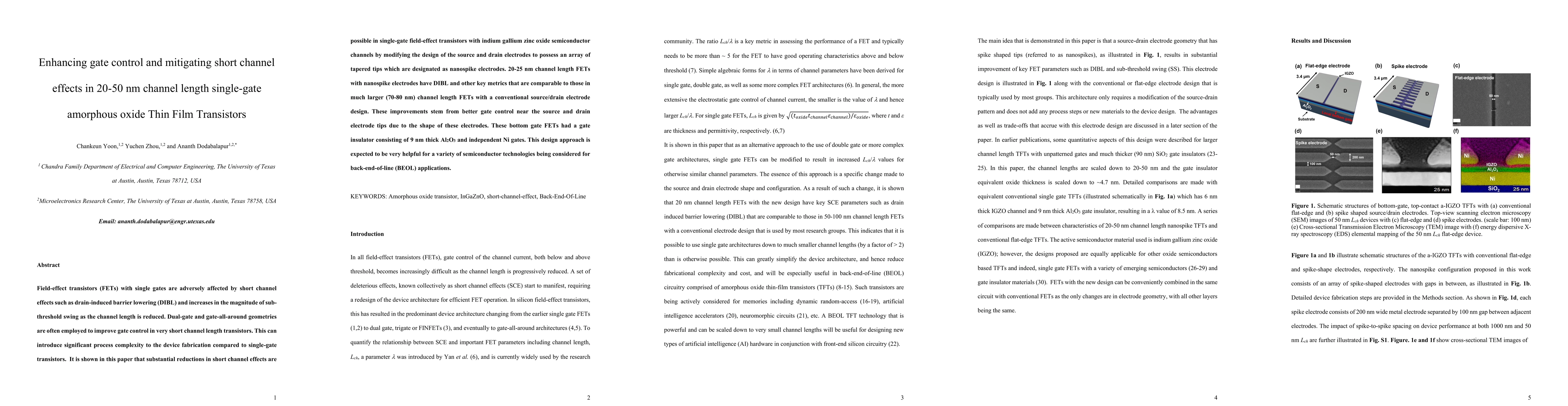 Field-effect transistors (FETs) with single gates are adversely affected by short channel effects such as drain-induced barrier lowering (DIBL) and increases in the magnitude of sub-threshold swing as the channel length is reduced. Dual-gate and gate-all-around geometries are often employed to improve gate control in very short channel length transistors. This can introduce significant process complexity to the device fabrication compared to single-gate transistors. It is shown in this paper that substantial reductions in short channel effects are possible in single-gate field-effect transistors with indium gallium zinc oxide semiconductor channels by modifying the design of the source and drain electrodes to possess an array of tapered tips which are designated as nanospike electrodes. 20-25 nm channel length FETs with nanospike electrodes have DIBL and other key metrics that are comparable to those in much larger (70-80 nm) channel length FETs with a conventional source/drain electrode design. These improvements stem from better gate control near the source and drain electrode tips due to the shape of these electrodes. These bottom gate FETs had a gate insulator consisting of 9 nm thick Al2O3 and independent Ni gates. This design approach is expected to be very helpful for a variety of semiconductor technologies being considered for back-end-of-line (BEOL) applications.