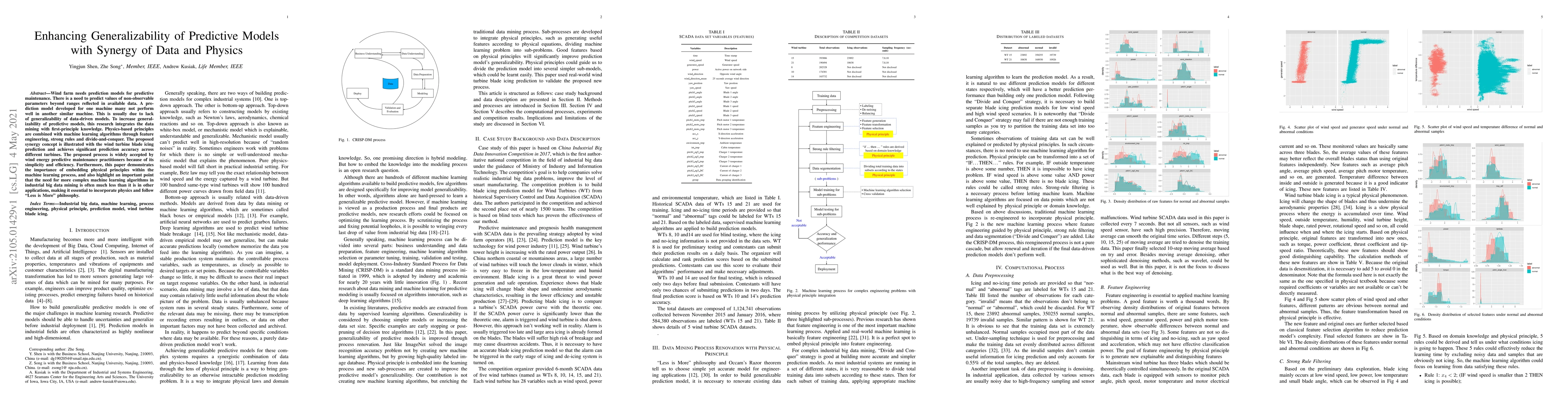 Wind farm needs prediction models for predictive maintenance. There is a need to predict values of non-observable parameters beyond ranges reflected in available data. A prediction model developed for one machine many not perform well in another similar machine. This is usually due to lack of generalizability of data-driven models. To increase generalizability of predictive models, this research integrates the data mining with first-principle knowledge. Physics-based principles are combined with machine learning algorithms through feature engineering, strong rules and divide-and-conquer. The proposed synergy concept is illustrated with the wind turbine blade icing prediction and achieves significant prediction accuracy across different turbines. The proposed process is widely accepted by wind energy predictive maintenance practitioners because of its simplicity and efficiency. Furthermore, this paper demonstrates the importance of embedding physical principles within the machine learning process, and also highlight an important point that the need for more complex machine learning algorithms in industrial big data mining is often much less than it is in other applications, making it essential to incorporate physics and follow Less is More philosophy.