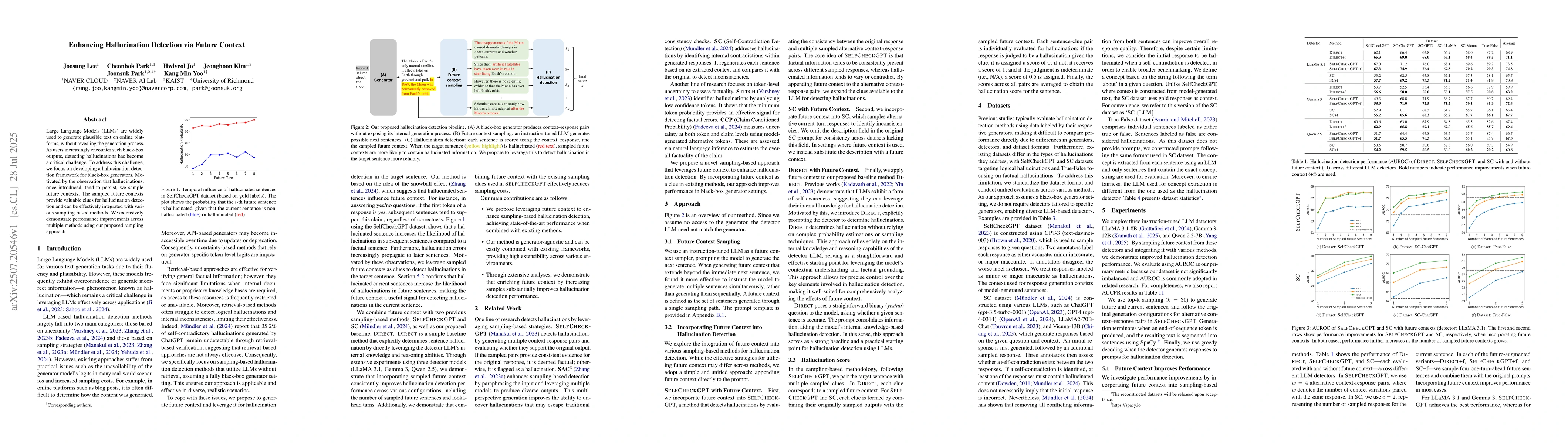 Large Language Models (LLMs) are widely used to generate plausible text on online platforms, without revealing the generation process. As users increasingly encounter such black-box outputs, detecting hallucinations has become a critical challenge. To address this challenge, we focus on developing a hallucination detection framework for black-box generators. Motivated by the observation that hallucinations, once introduced, tend to persist, we sample future contexts. The sampled future contexts provide valuable clues for hallucination detection and can be effectively integrated with various sampling-based methods. We extensively demonstrate performance improvements across multiple methods using our proposed sampling approach.