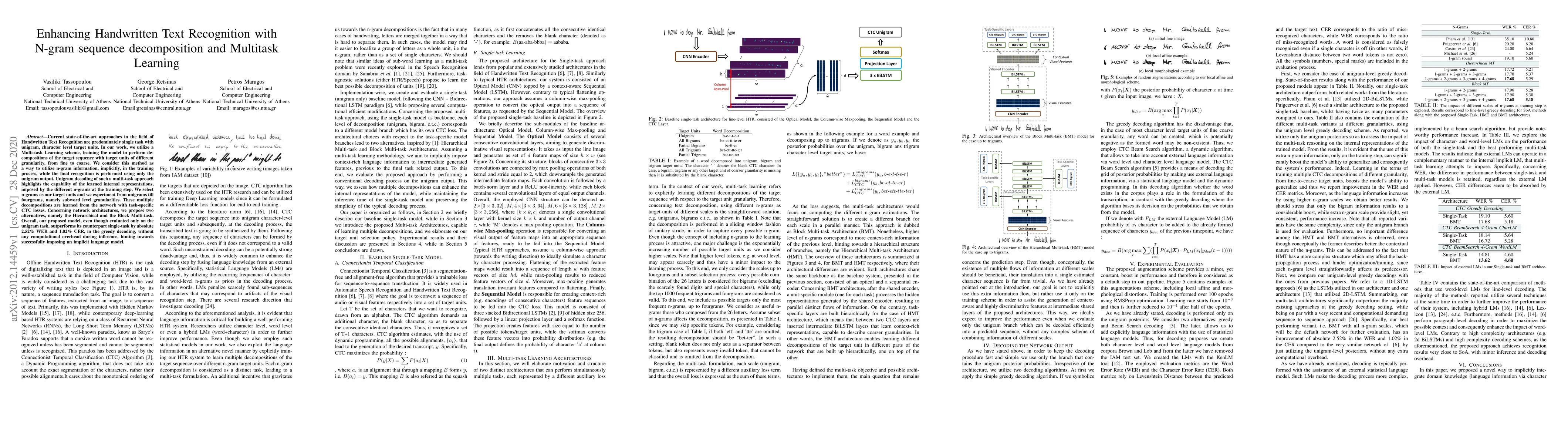 This paper proposes a Multi-task Learning approach for Handwritten Text Recognition, utilizing n-gram sequence decompositions to implicitly incorporate n-gram information during training. The model outperforms single-task models by 2.52% in Word Error Rate and 1.02% in Character Error Rate, demonstrating the effectiveness of the proposed multi-task learning framework.